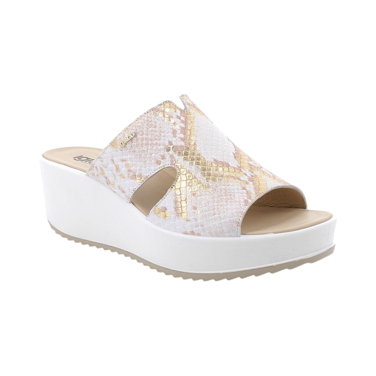 Lo Scalzato firmato Igi&Co, realizzato in pelle è caratterizzato da una fascia larga con stampa stampa pitonata e da comodo plantare in pelle, grazie alla zeppa alta 6cm, puoi osare in grande stile ogni giorno!