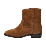 Lo Stivaletto firmato Janet&Janet, realizzato in camoscio cognac calzata slip on è caratterizzato da intreccio laterale in pelle, plantare in pelle e fondo gomma antiscivolo con tacco di 2cm.