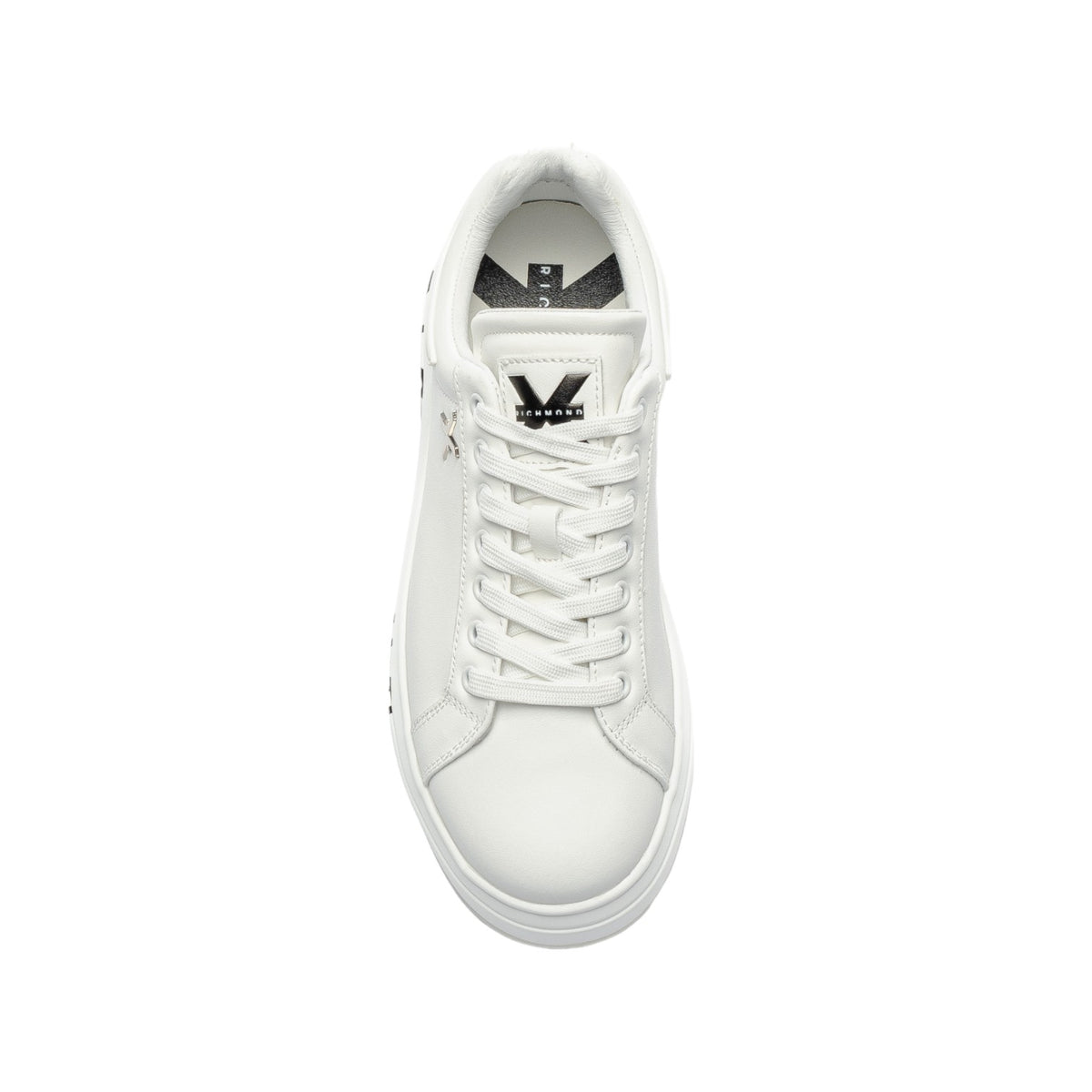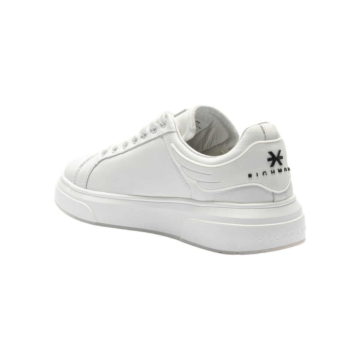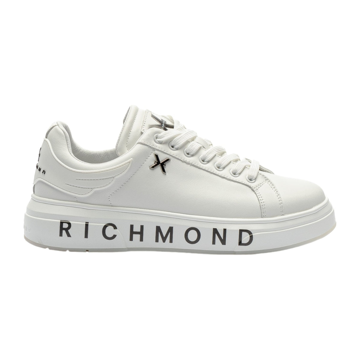 La Sneakers firmata John Richmond, realizzata in pelle è caratterizzata da logo "Richmond X" sul retro e lato, e da fondo in gomma con logo stampato a contrasto di colore. Comoda chiusura a lacci, e inoltre presenta un inserto posteriore in gomma bianca, modello ideale per un look casual e moderno.