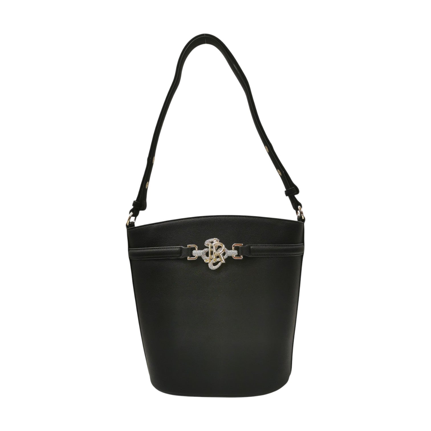 La Borsa a tracolla firmato John Richmond, realizzata in ecopelle modello a secchiello, con struttura semi-rigida. Presenta un apertura con patta e bottone magnetico, sulla parte frontale troviamo al centro il logo 'JR'' contornato da uno snake in metallo che riprende il logo del brand. Tracolla regolabile con bottoncino cosi da poterla portare sia a spalla che a tracolla.