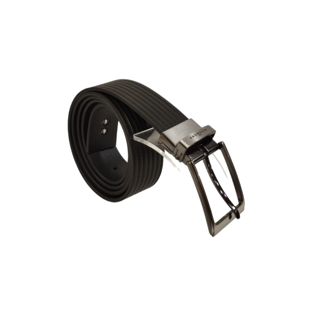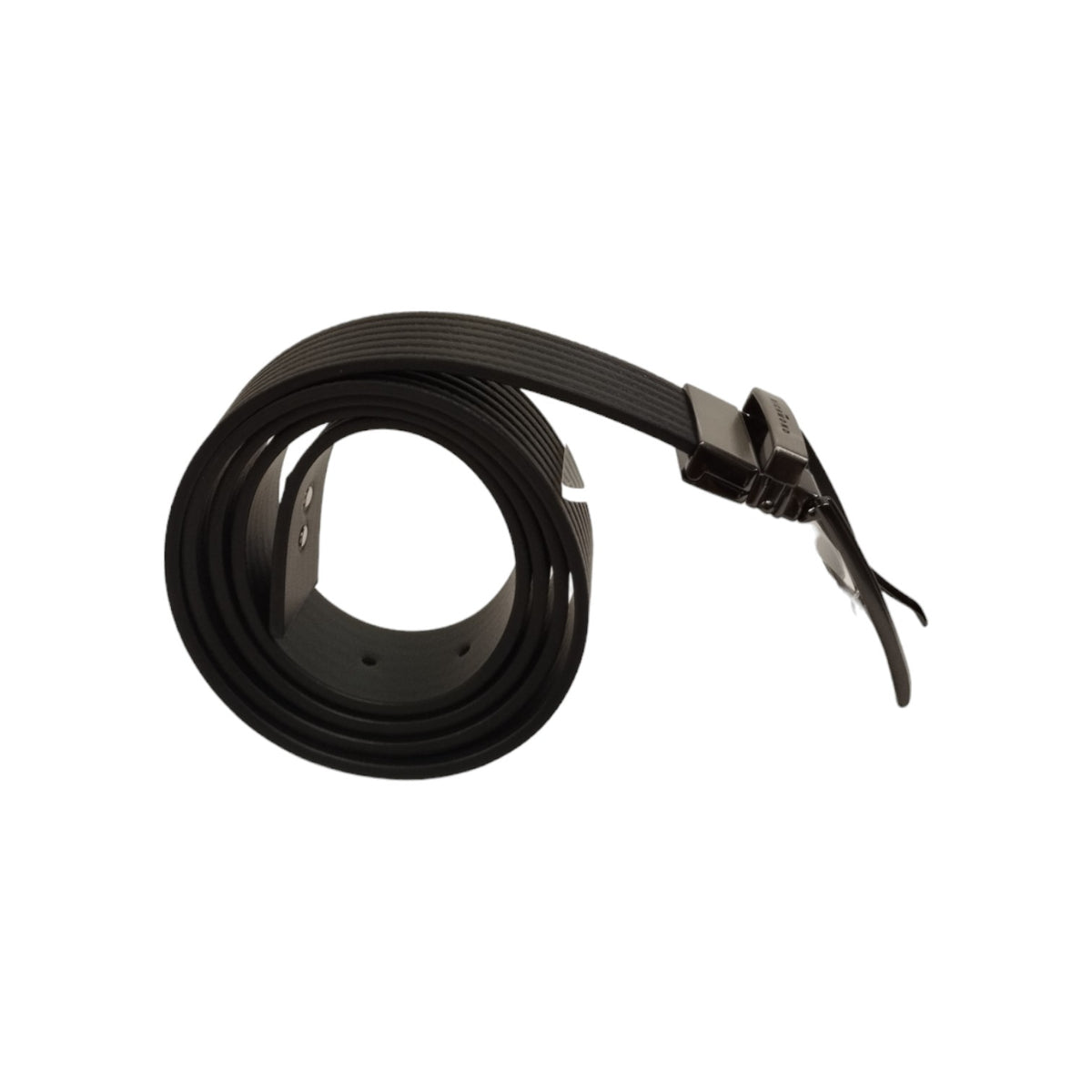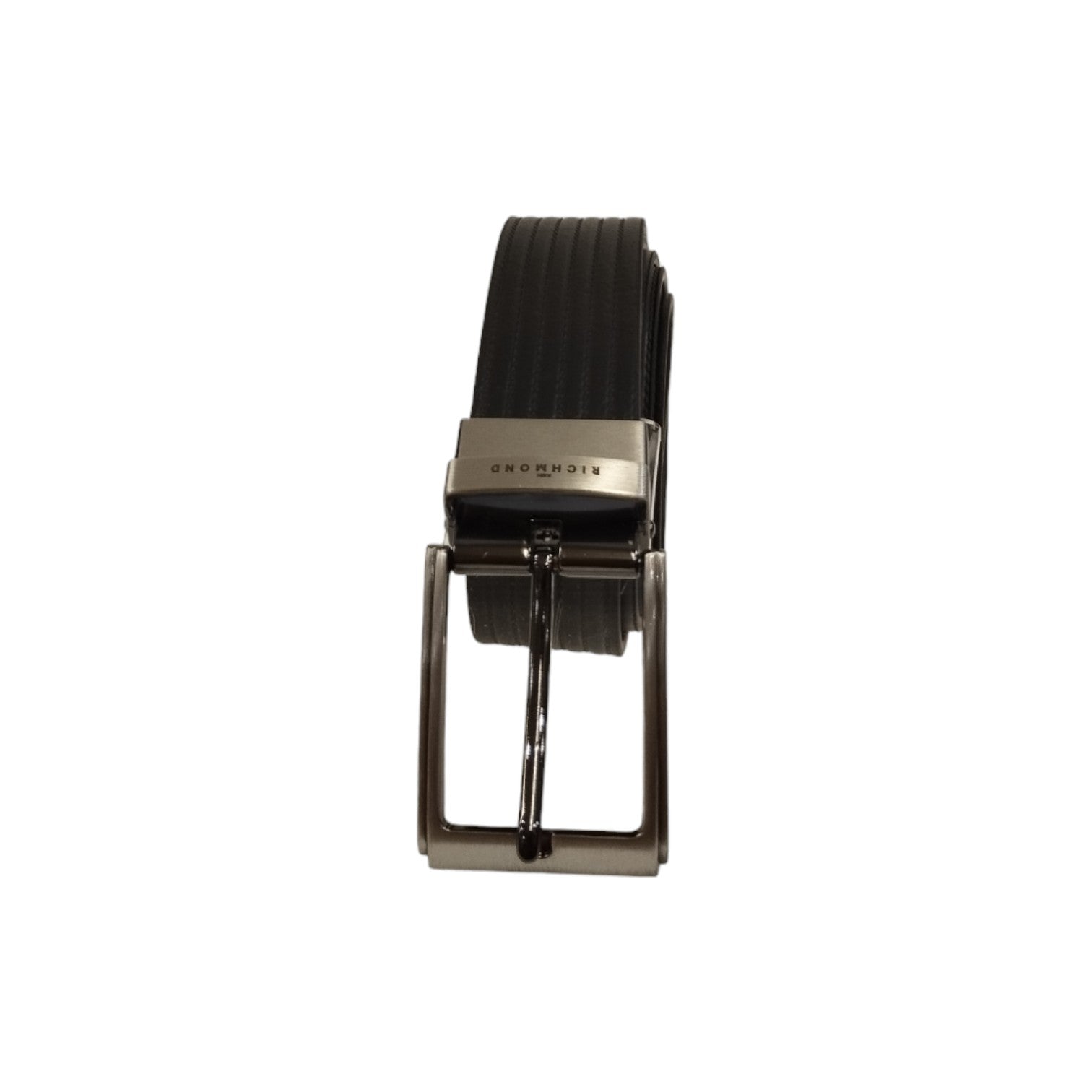 La Cintura firmata John Richmond, realizzata in pelle qui proposta nella variante nera è caratterizzata da trama a righe verticali e una fibbia metallica in acciaio rettangolare logata.