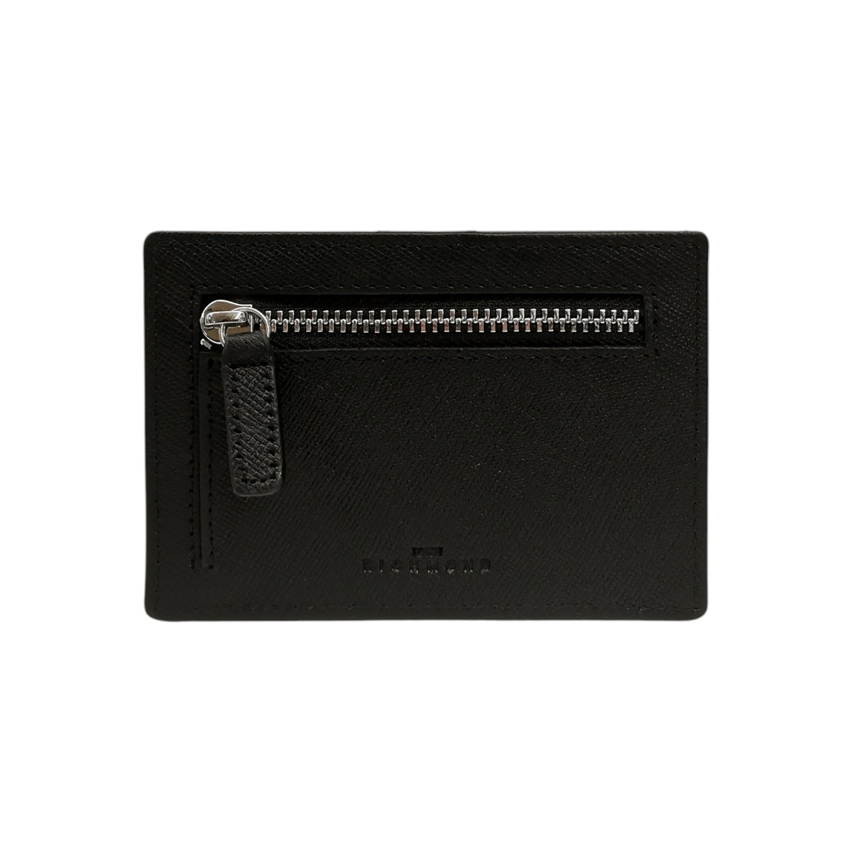 Il Portacarte firmato John Richmond, realizzato in pelle nera effetto saffiano, presenta un doppio scomparto con chiusura passante per inserire documenti come patente di guida e carta di identità elettroniche, sul retro è presente una tasca con zip. Ha una tasca esterna sul retro per le monete e la scritta del logo bianca sul fronte.