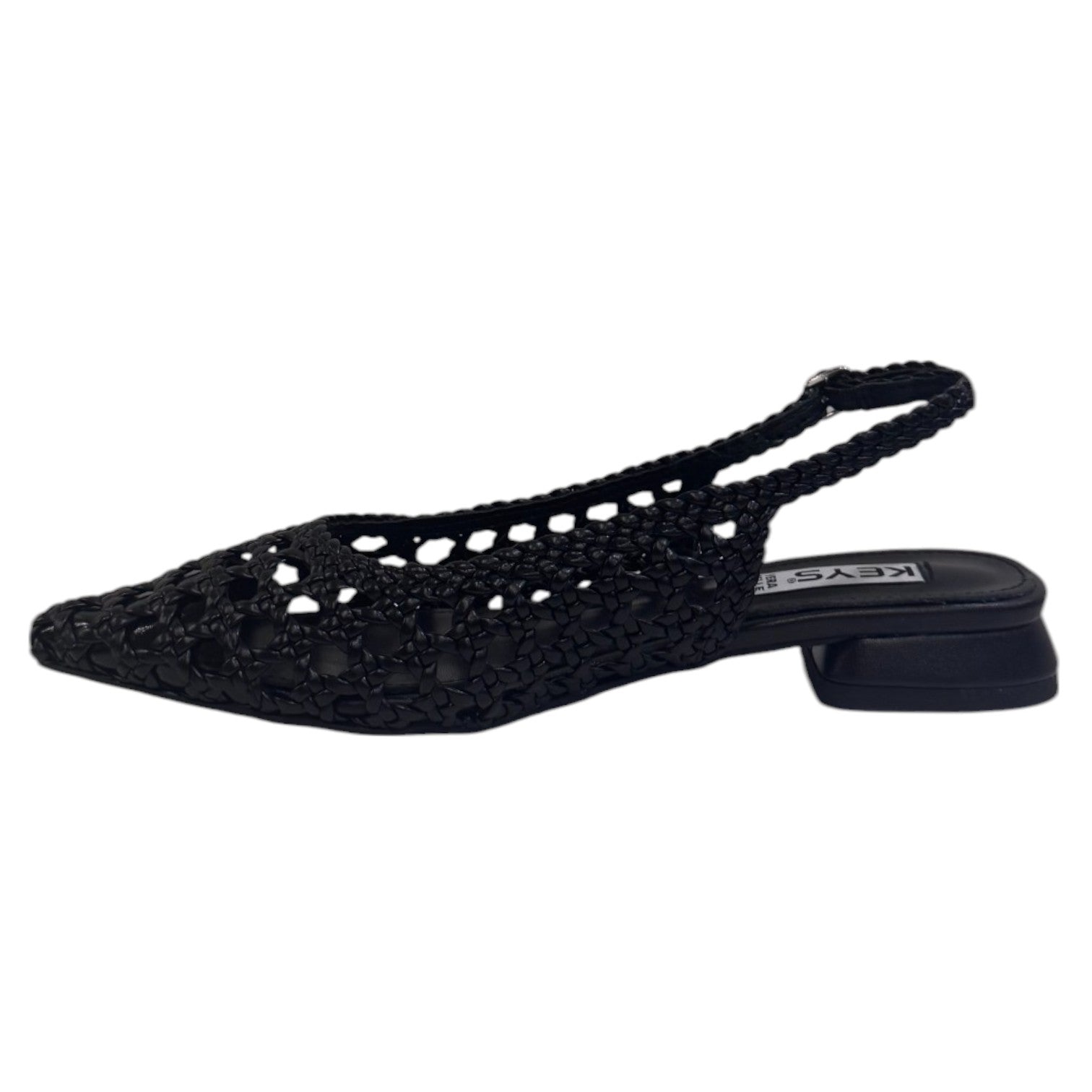 La Chanelle firmata Keys, in questa bellissima variante nera realizzata in ecopelle è caratterizzata da fantasia intrecciata traforata e da interno in ecopelle con plantare in pelle, inoltre dispone di tacco basso di 2cm per essere fashion ma comodi.