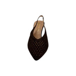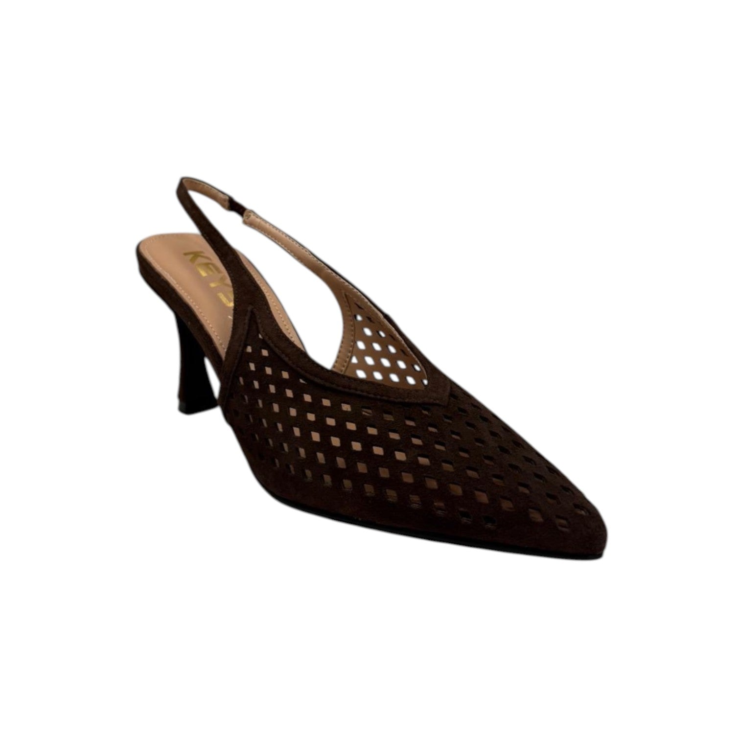 La Chanelle firmata Keys, è sinonimo di eleganza e raffinatezza, realizzata in camoscio marrone con una punta affusolata, ha un tacco a rocchetto alto 9cm che garantisce una postura impeccabile. Il design con trama traforata, dimostra che la vera eleganza sta nella semplicità.