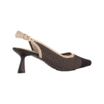 La Chanelle firmata Keys, realizzata in tessuto presenta una raffinata lavorazione traforata impreziosita da dettagli in nero e beige. Il plantare in pelle garantisce il massimo comfort durante la giornata, mentre il tacco a rocchetto di 7 cm aggiunge una nota di sofisticatezza.