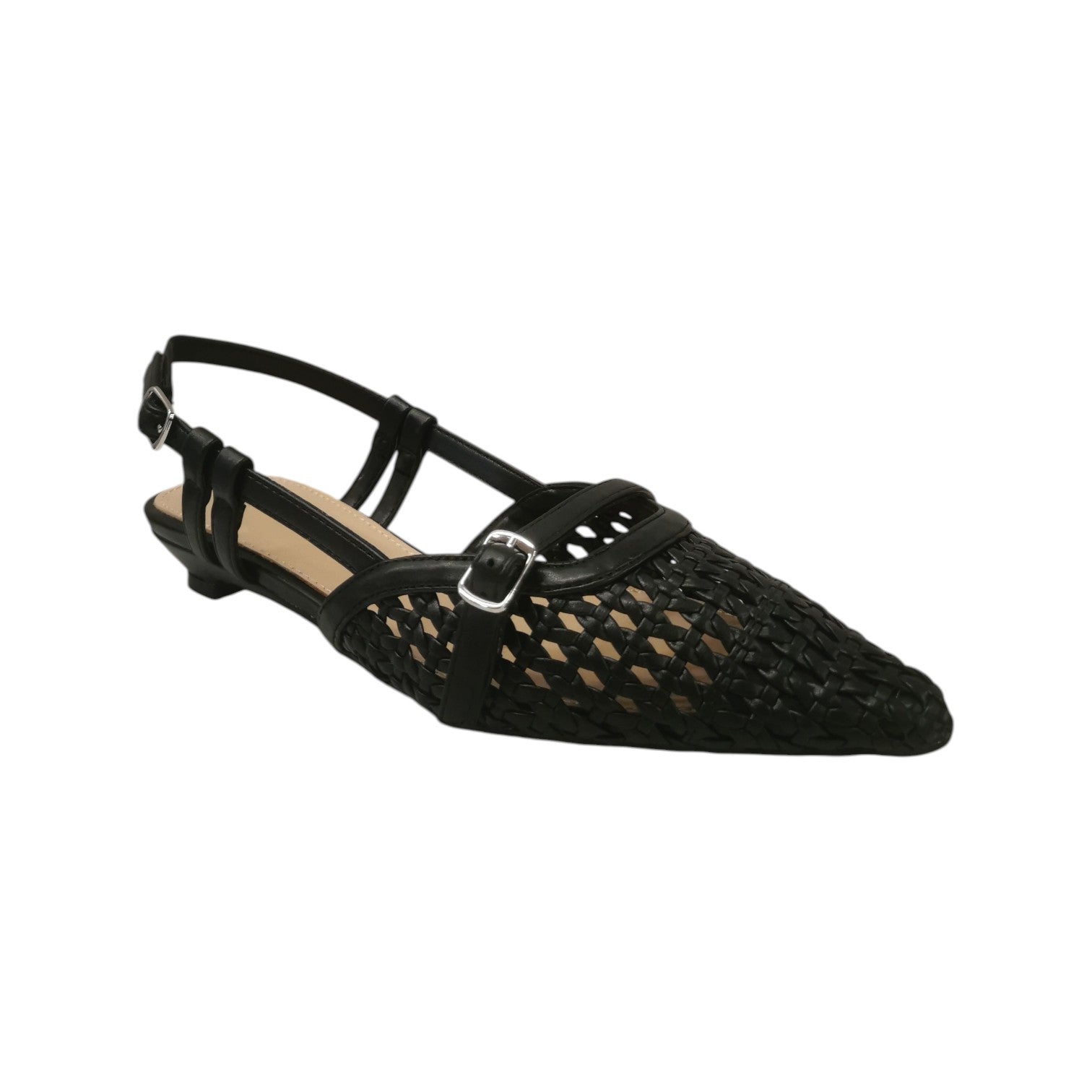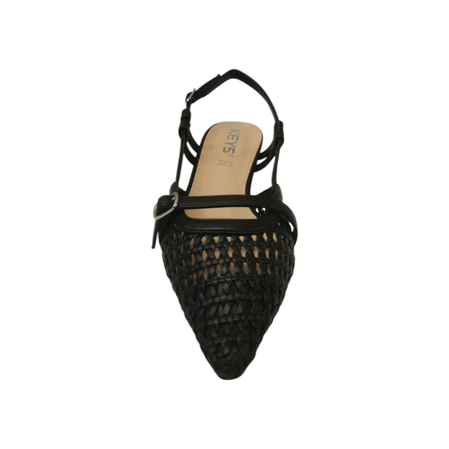 La Chanelle firmata Keys, realizzata in ecopelle qui proposta nella variante nera è caratterizzata da un cinturino con fibbia regolabile e da trama intrecciata traforata, mentre il comodo plantare rivestito in pelle assicura stabilità e comfort tutta la giornata.