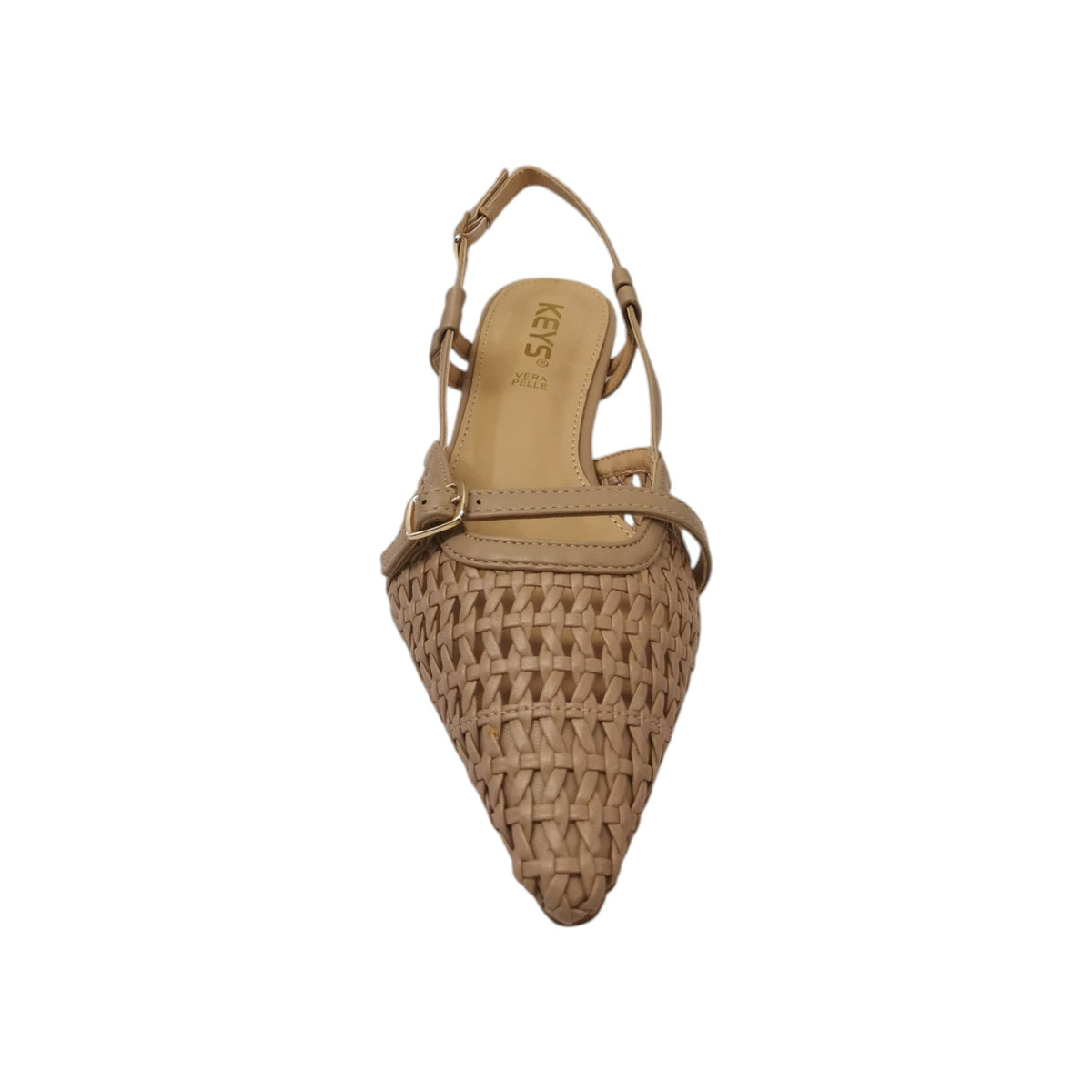 La Chanelle firmata Keys, realizzata in ecopelle qui proposta nella variante nocciola è caratterizzata da un cinturino con fibbia regolabile e da trama intrecciata traforata, mentre il comodo plantare rivestito in pelle assicura stabilità e comfort tutta la giornata.