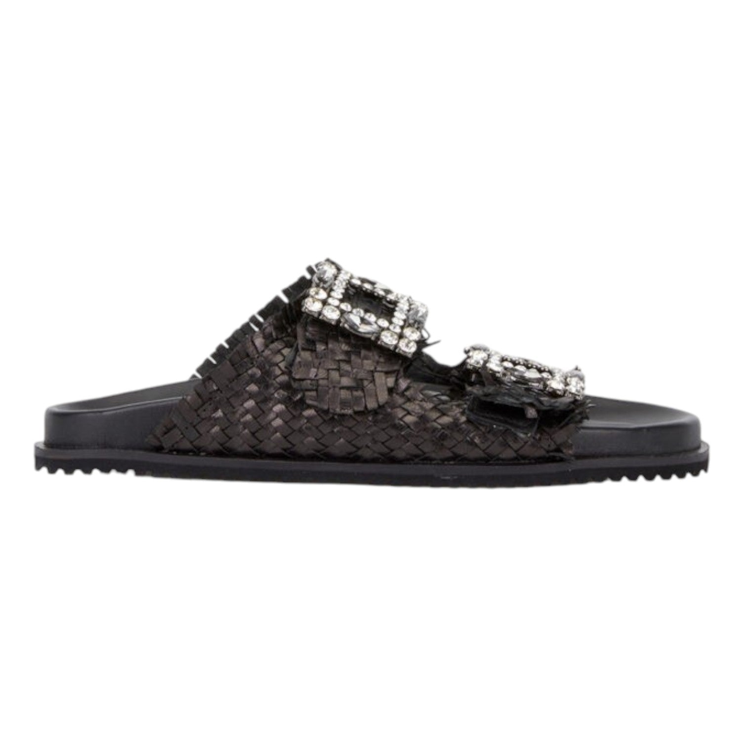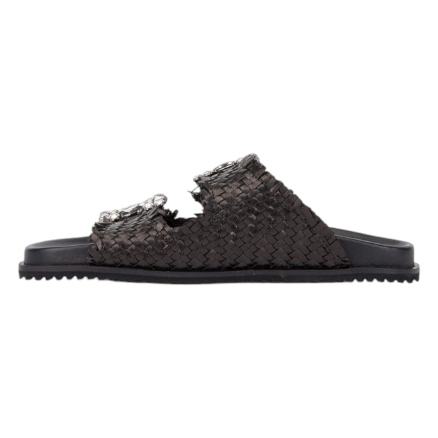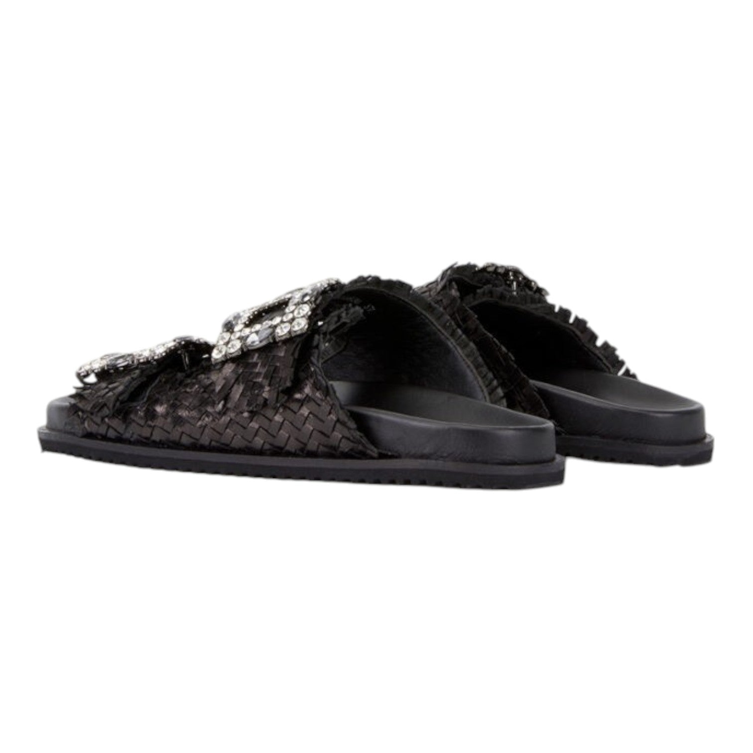 Keys Ciabatta Donna in Pelle Intrecciata Nera con Maxi Fibbie Gioiello
