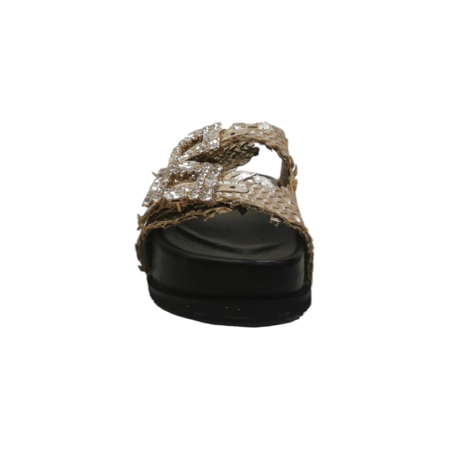 La Ciabatta firmata Keys, realizzata in pelle intrecciata è caratterizzata da maxi fibbie gioiello gli danno un tocco di eleganza che trasforma qualsiasi look, senza sacrificare la comodità grazie alla suola in vera pelle. Puoi abbinarlo a un outfit casual per il giorno o sfoggiarlo anche la sera per un'aria sofisticata.