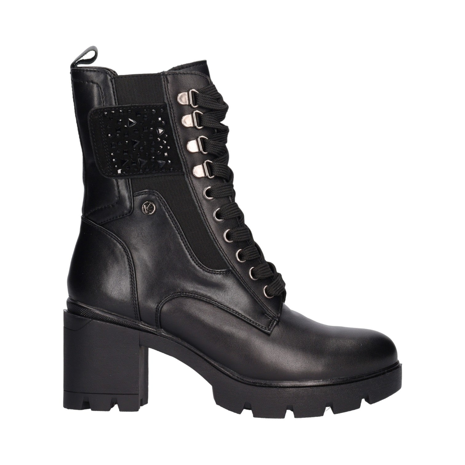 L'Anfibio firmato Keys, realizzato in pelle è caratterizzato da una comoda chiusura con lacci e zip laterale. Presenta un'applicazione con strass ed elastico laterale, con fodera in tessuto imbottita e fondo in gomma antiscivolo tacco di 7cm.