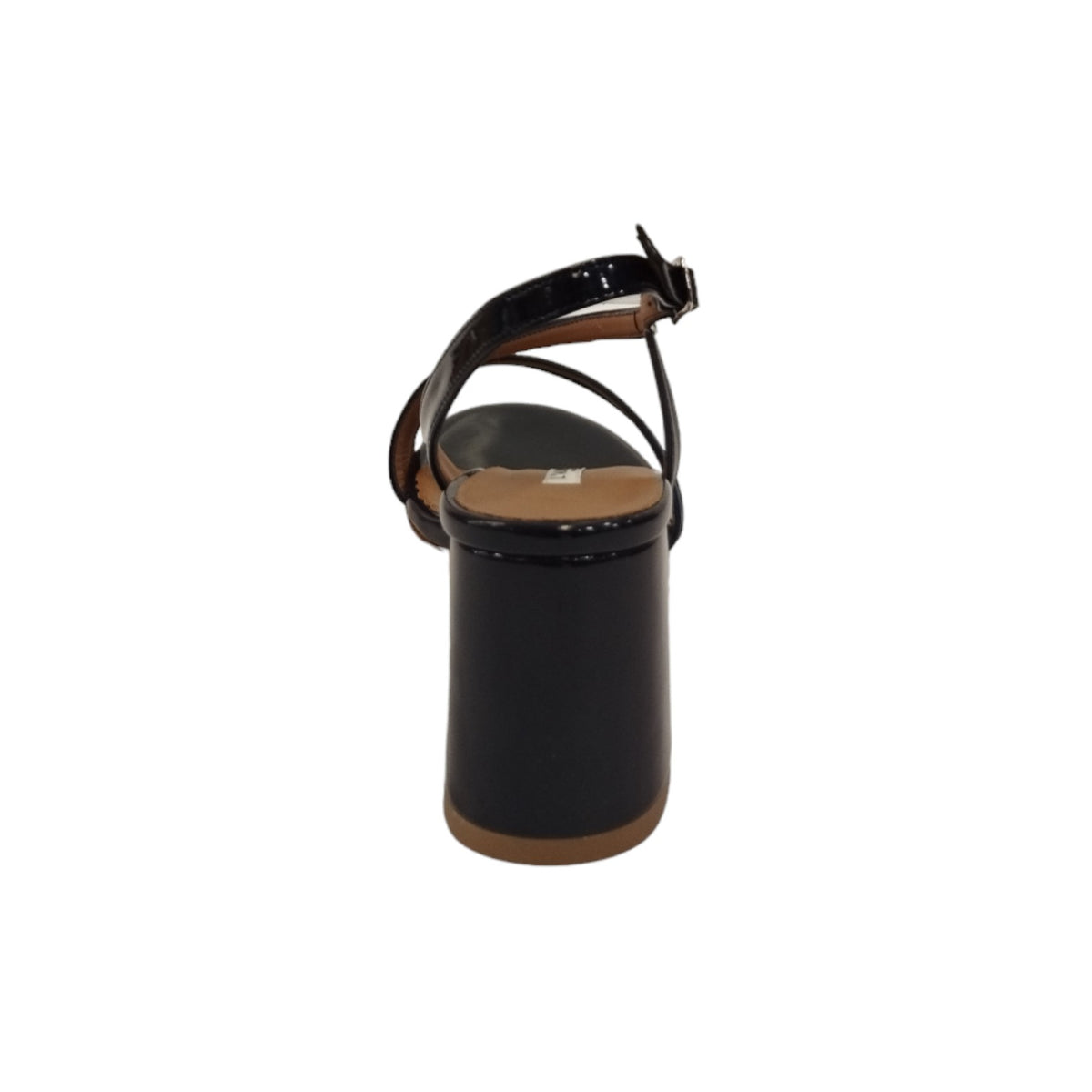 Il Sandalo firmato L'Amour by Albano, realizzato in ecopelle è caratterizato da inserti in vernice, e da una fascia lungo il dorso che abbraccia il piede, inoltre presenta un tacco a blocco alto 7cm e cinturino alla caviglia.