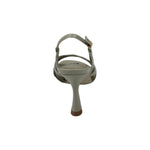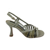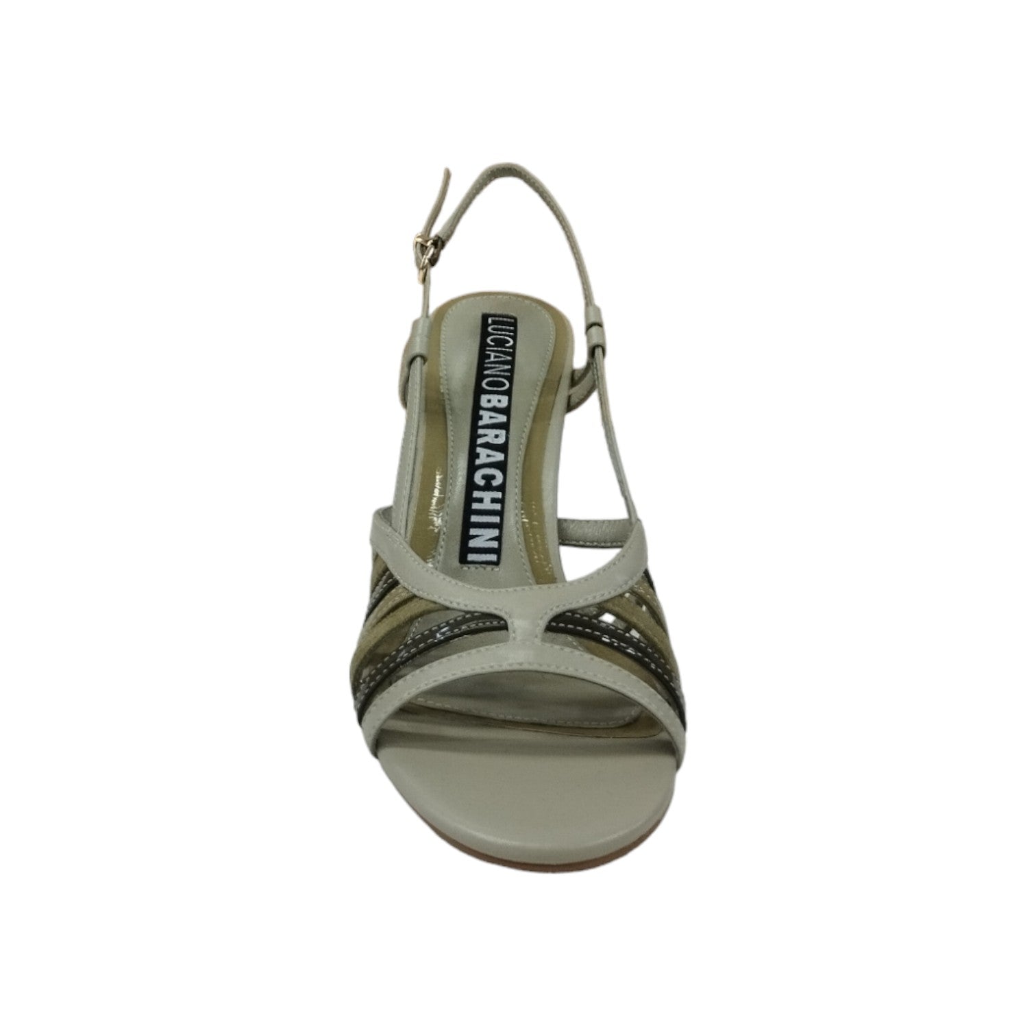 Il Sandalo firmato Luciano Barachini, realizzato in pelle presenta sette fascette a raccogliere l‘avampiede e punta squadrata, dotato di comodo tacco a rocchetto alto 9cm e di sottopiede in pelle imbottito dal tallone fin tutto l’arco plantare.