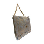 La Borsa a spalla firmata M Brc, della Linea Bikini realizzata in tessuto è caratterizzata da inserti celesti e dorati, e da interno senza taschini disponibili, presenta un manico a catena dorato