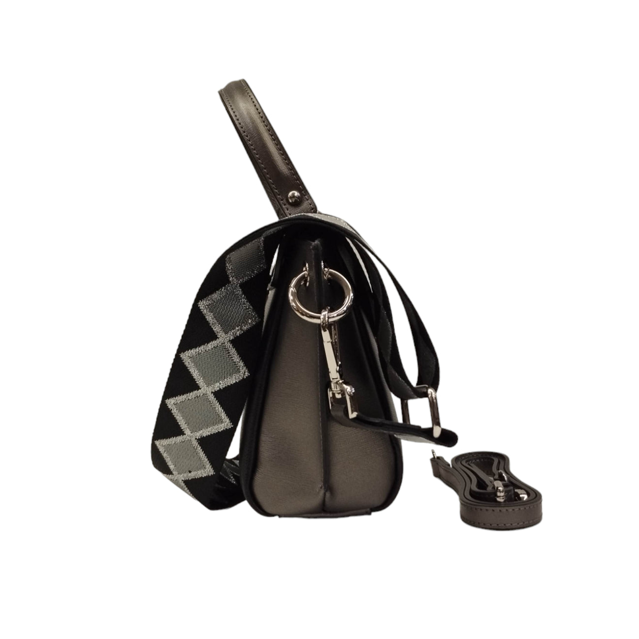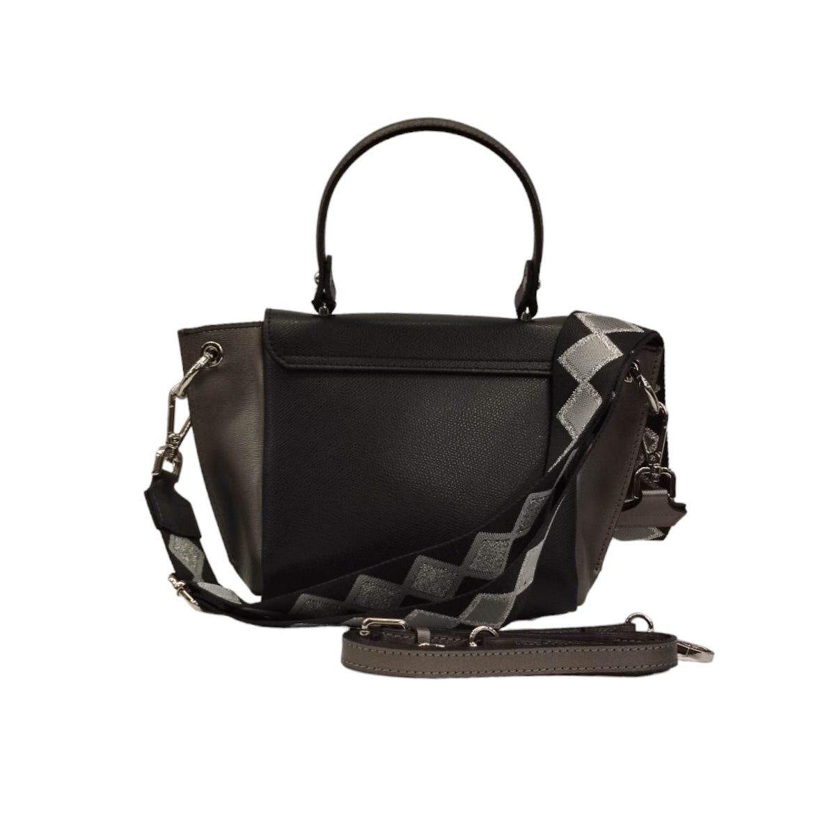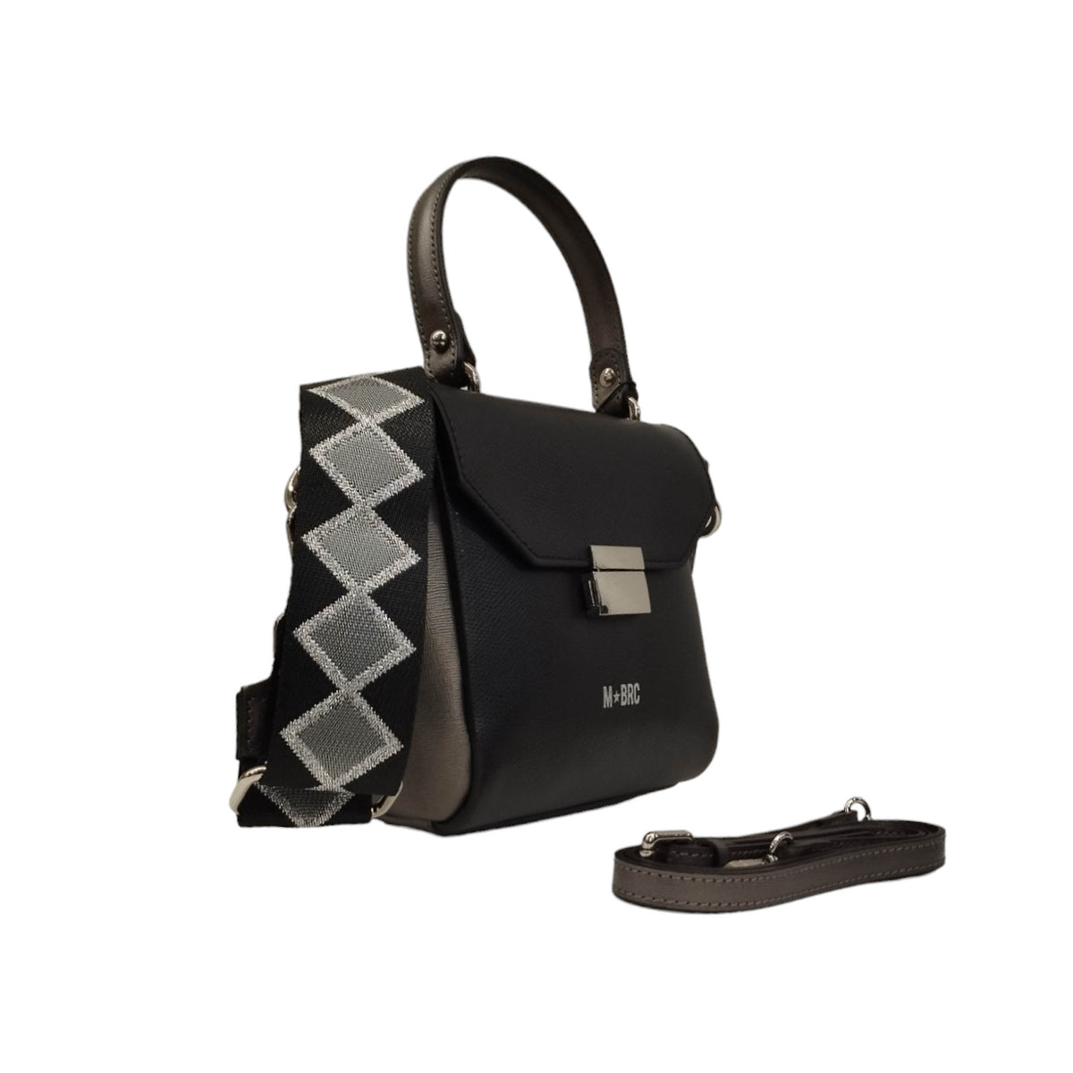 La Borsa a mano firmata M Brc, realizzata in pelle può essere portata anche a tracolla, presenta due tracolle una con fantasia in tessuto e l'altra in pelle, interno foderato in tessuto con una tasca con zip.