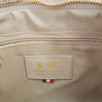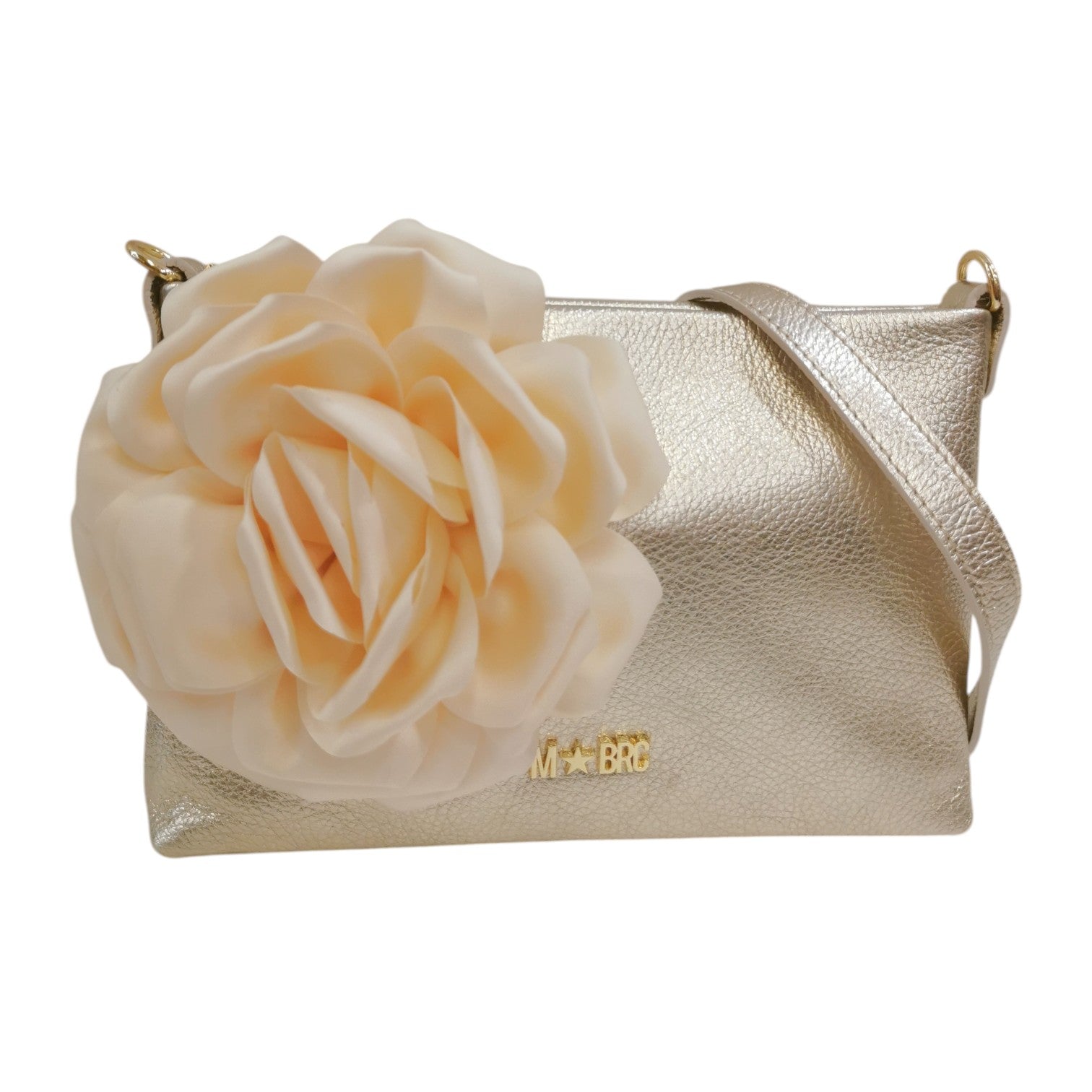 La Pochette firmata M Brc, della Linea Dream realizzata in pelle laminata minibag chiusa da cerniera superiore dispone di tracolla in pelle removibile. Particolare il motivo del fiore in stoffa applicato sul lato che la rendere adatta ad ogni look: dal più casual al più particolare.