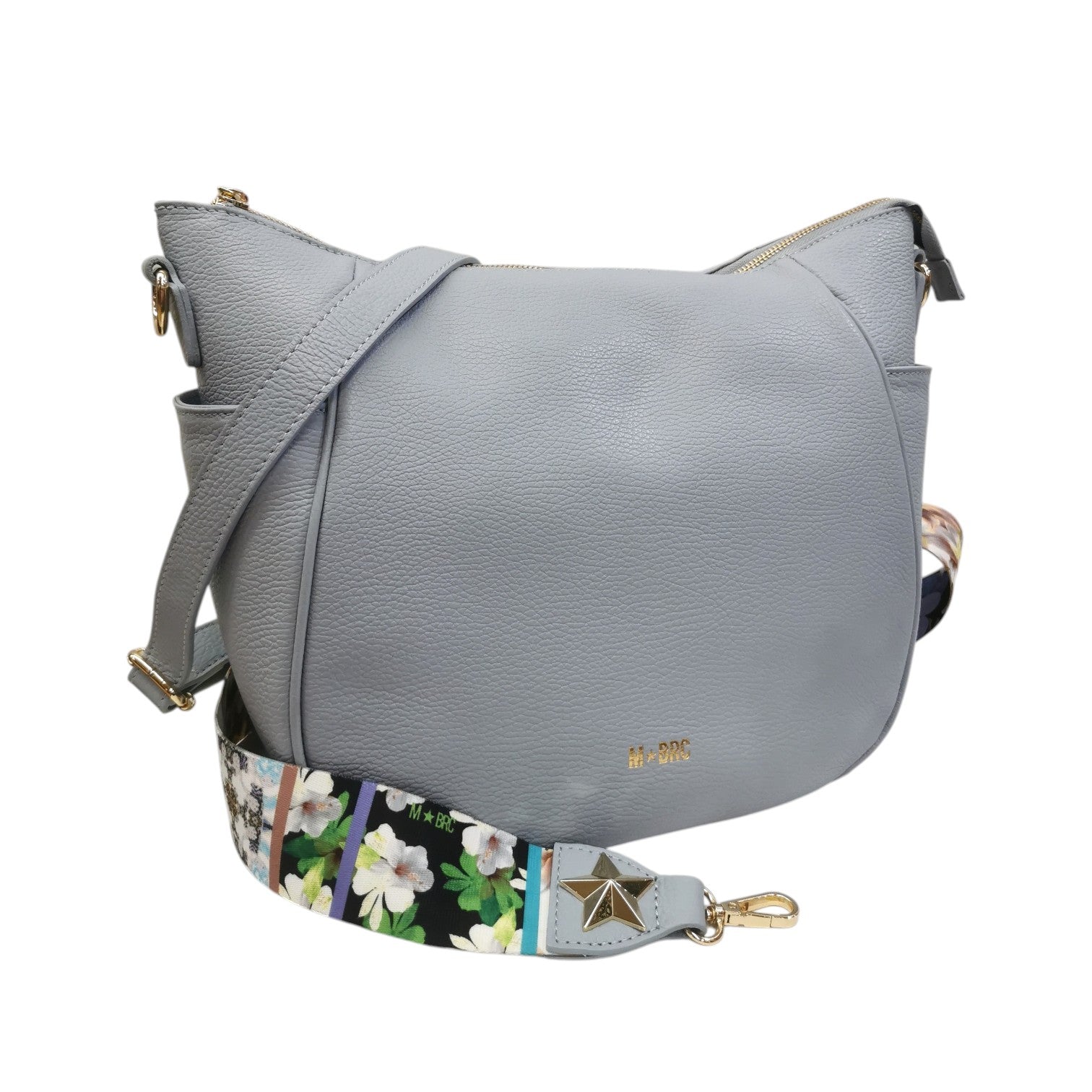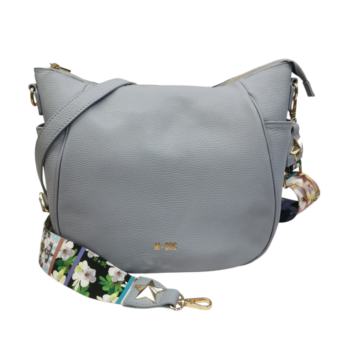 La Borsa a tracolla firmata M Brc, della Linea Obona realizzata in vera pelle è caratterizzata da doppia tracolla una in pelle ed una in tessuto a fantasia entrambe regolabili e removibili, presenta 2 tasche laterali aperte e una tasca interna chiusa con zip per tenere tutto al sicuro e a portata di mano.