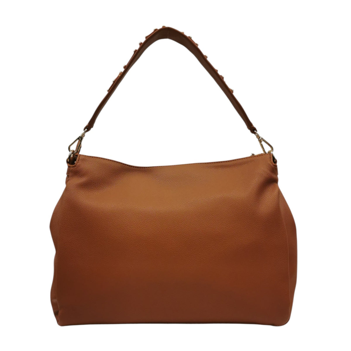 La Borsa a spalla firmata Mario Valentino, realizzata in ecopelle qui proposta nella variante cuoio è caratterizzata da logo lettering frontale in metallo e da manico removibile con applicazione di borchiette, mentre l'interno è foderato in tessuto di cui dispone di tasca con zip.