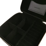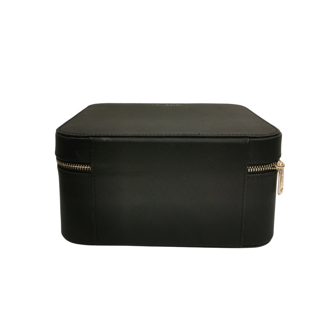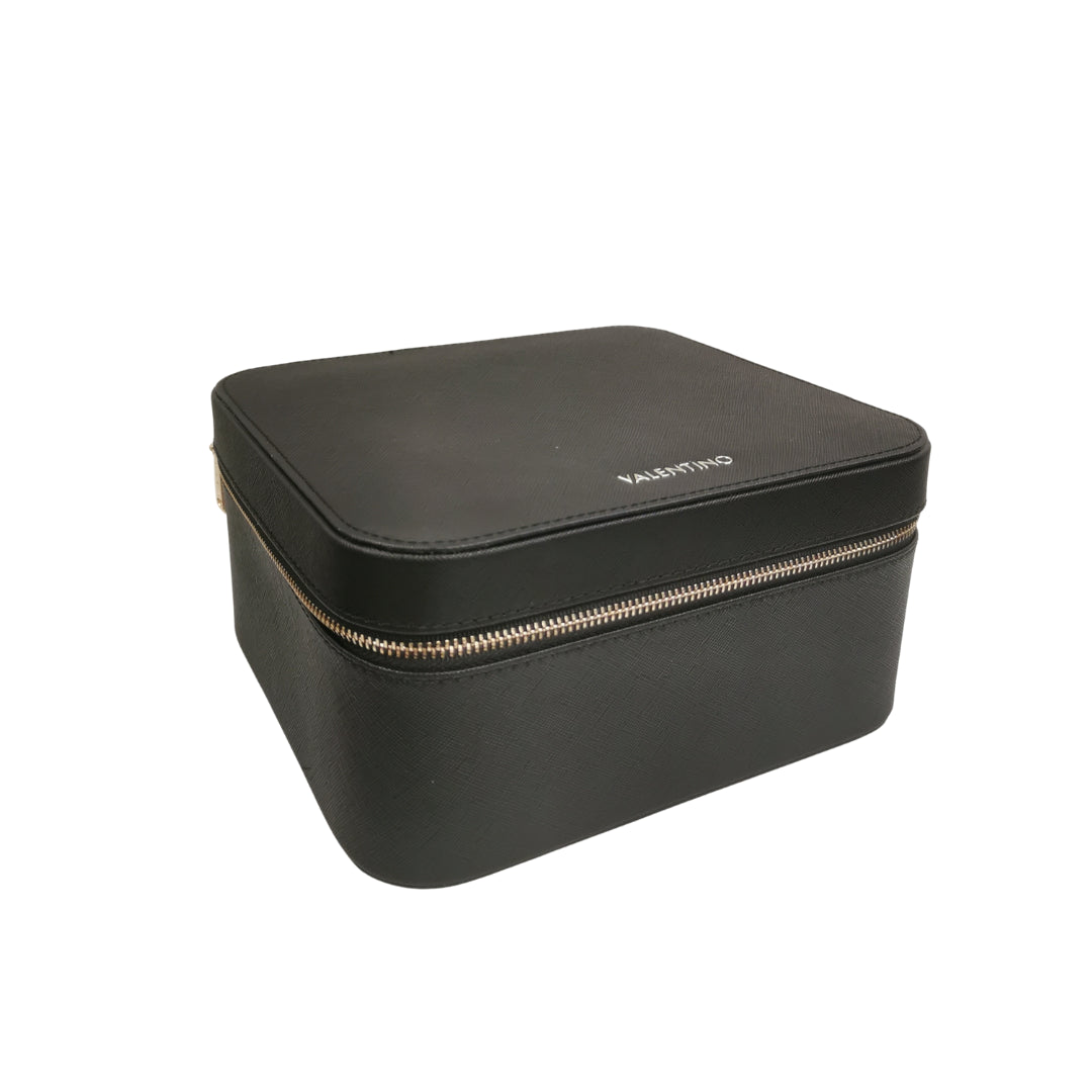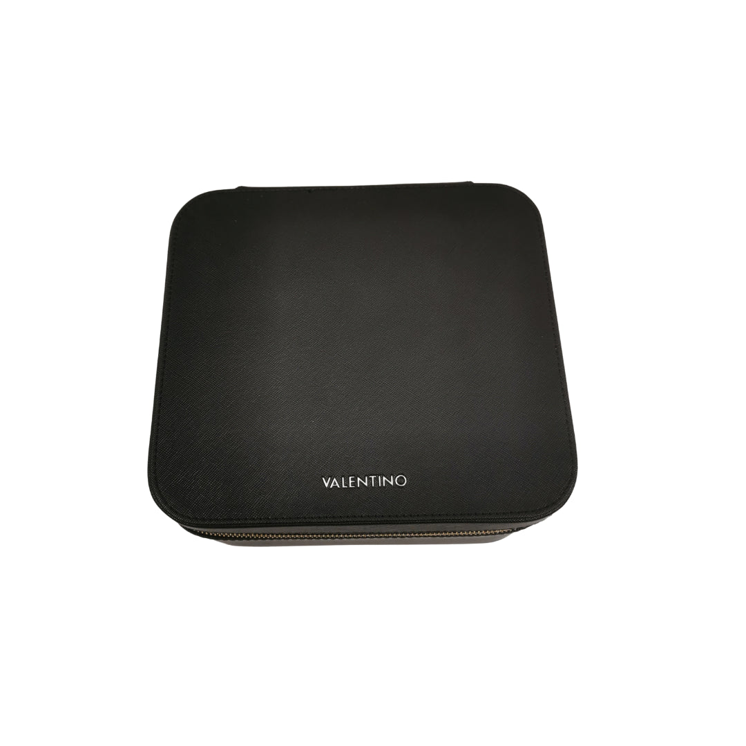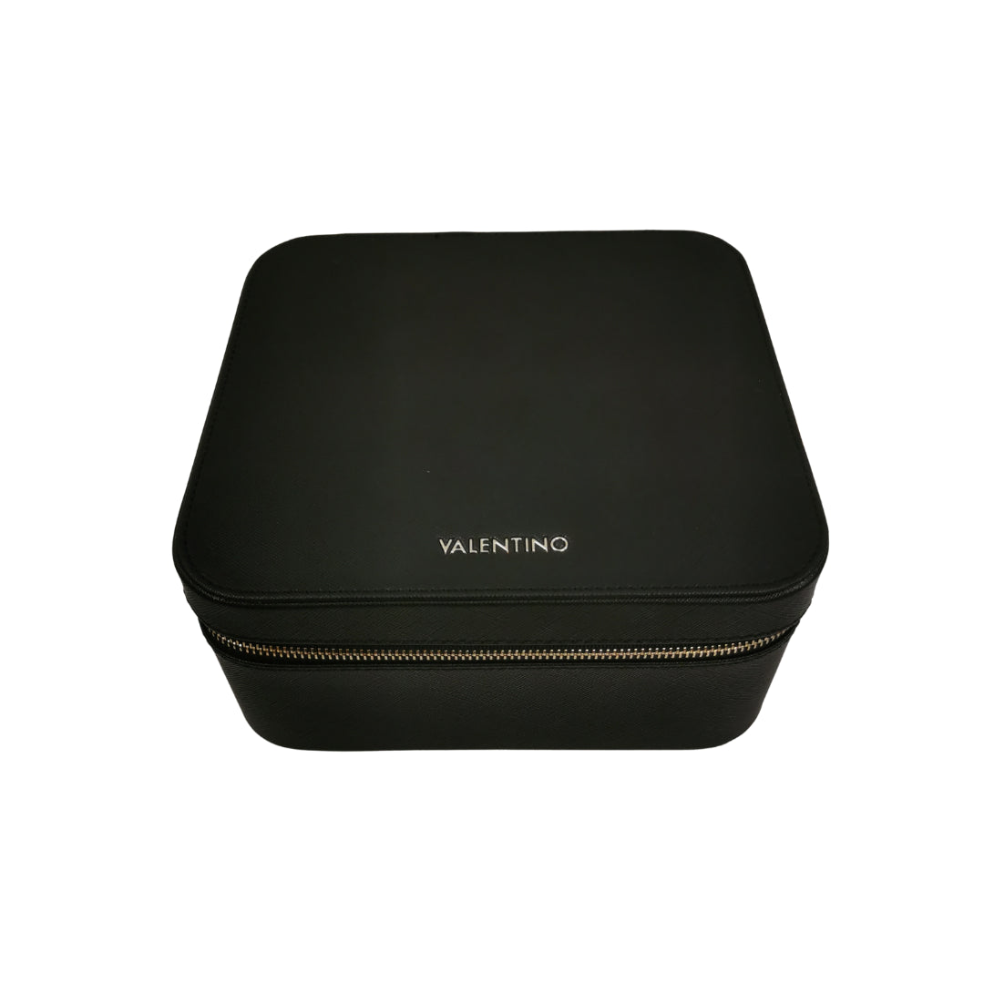 Il grande portagioie firmato Mario Valentino in ecopelle nera, è una soluzione spaziosa ed elegante per riporre tutti i tuoi gioielli. Il portagioie si apre con una cerniera su tre lati ed è suddiviso in cinque scomparti funzionali all'interno: uno scomparto per anelli e orecchini e quattro scomparti per collane, bracciali e spille. Nel coperchio è presente una tasca a bustina e due cinghie che possono essere utili per fissare collane. All'interno è rivestito di morbido velluto, che protegge i tuoi gioielli, mentre sull'esterno è decorata con l'elegante logo lettering.