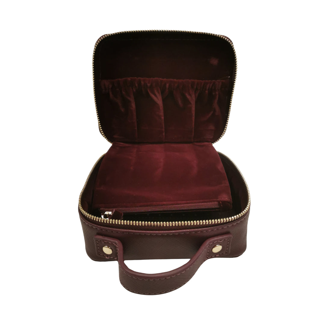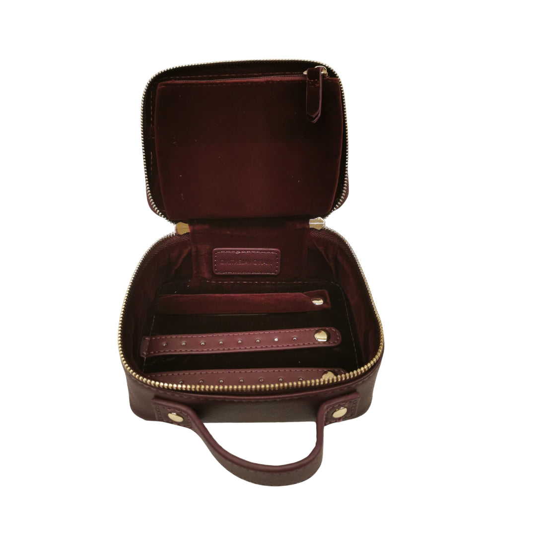 Il piccolo Porta gioie firmato Mario Valentino realizzato in ecopelle prugna, è una soluzione elegante e pratica per riporre tutti i tuoi gioielli. Il piccolo portagioie si apre con una zip presenta sui tre lati. L'interno è principalmente fatto di morbido velluto, compreso di due tasche di cui una con chiusura a zip, due cinghe per riporre collane, bracciali e spille. Sul lato superiore presenta un piccolo manico. Pratico da portare con se, in un viaggio o da tenere nella propria borsa.