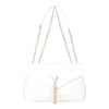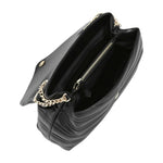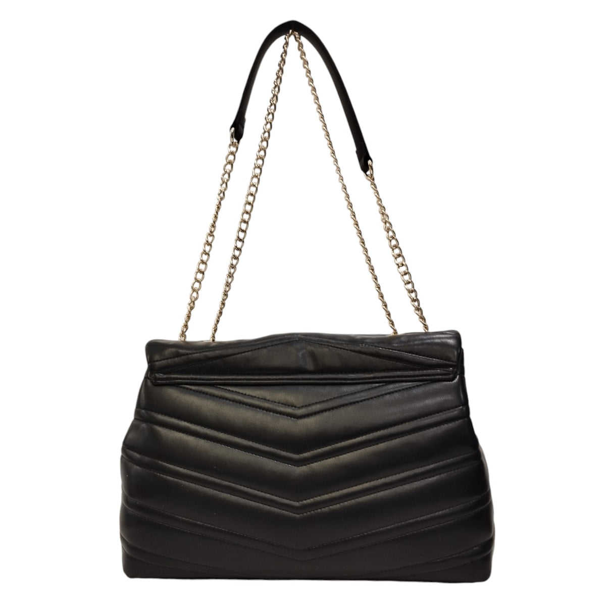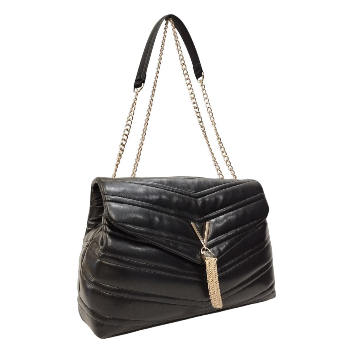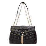 La Tracolla firmata Maria Valentino, realizzata in morbida ecopelle dal design trapuntato in stile Chevron sulla borsa, è caratterizzata da una tracolla a catena dorata con dettagli in ecopelle nera. All'interno ha due tasche e una tasca centrale con chiusura a zip, e presenta un logo con scritta Valentino sulla parte anteriore della borsa con un lucchetto e dettagli a catena.