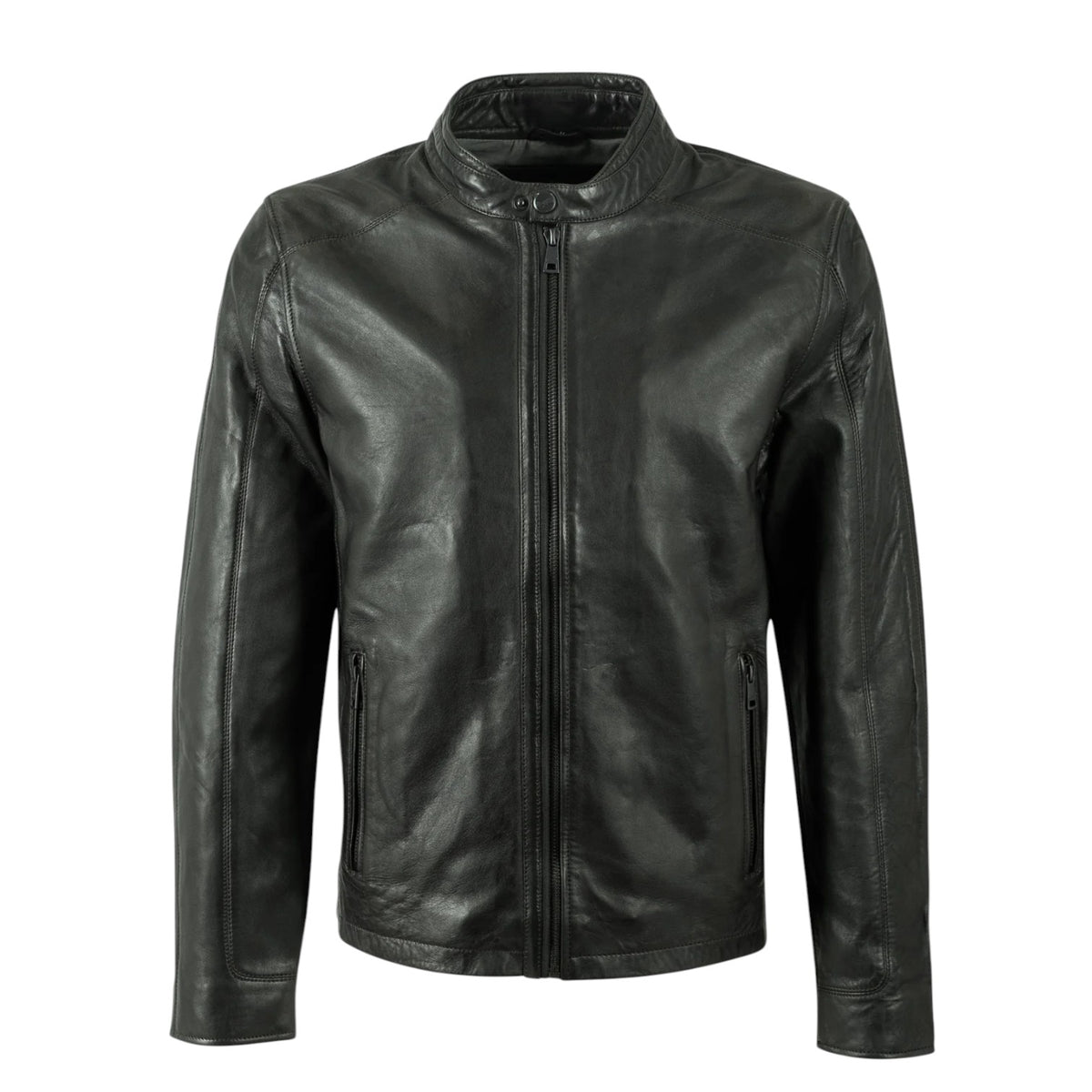 Il Giubbotto firmato Mauritius, modello da motociclista dalla vestibilità regolare realizzato in vera pelle nera è caratterizzato da collo alto con bottone automatico e tasche laterali con cerniera.