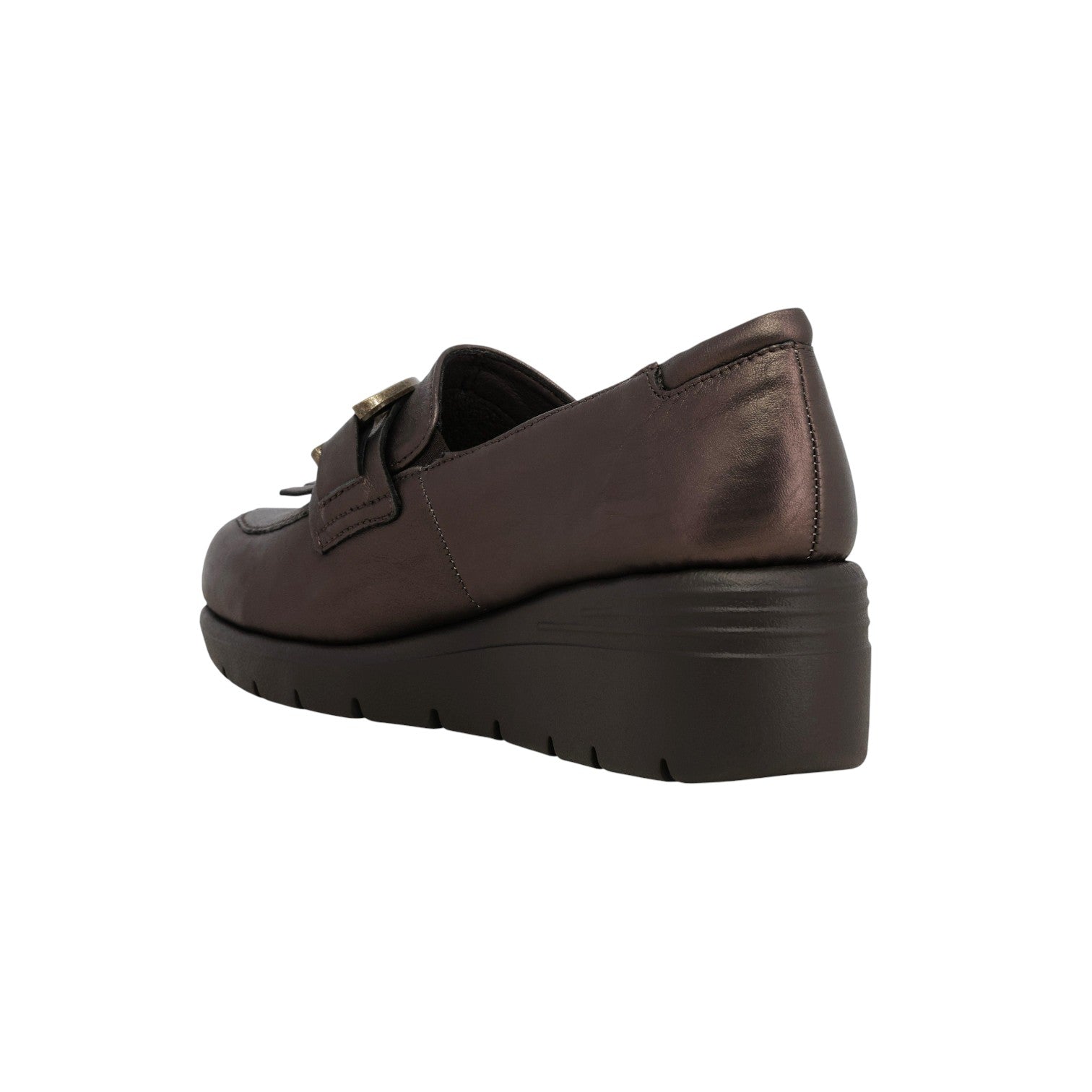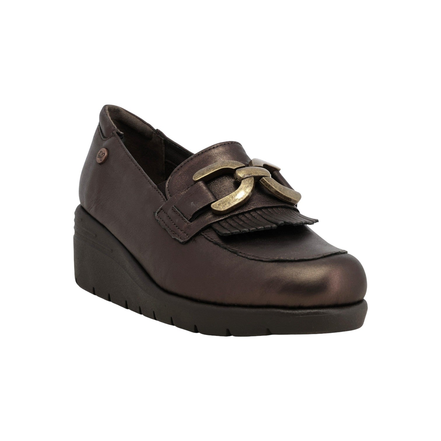 Il Mocassino firmato Melluso, realizzato in pelle qui proposto nella variante bronzo è caratterizzato da zeppa di 6cm e da dettaglio catena con frange applicate per dare un tocco in più. Presenta un plantare foderato in pelle per un maggior comfort.