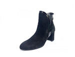 Il Tronchetto firmato Melluso, realizzato in camoscio è impreziosito da inserti in vernice ed elastico in tessuto laterale. Modello dalla comoda chiusura con zip laterale e tacco largo alto 7cm con fondo in gomma antiscivolo.