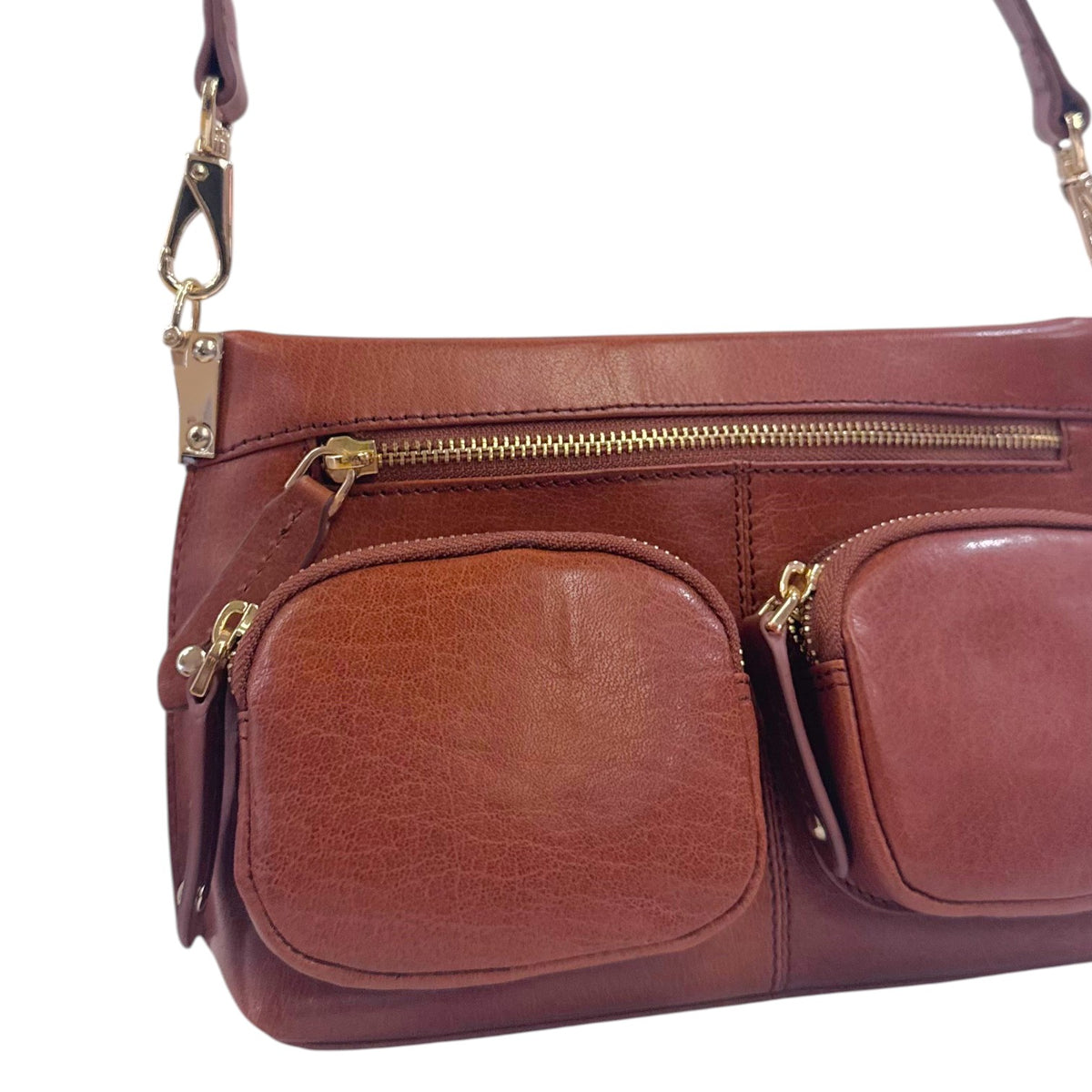 La Borsa a spalla firmata Mia Stella, realizzata dall'unione di morbida pelle di vitello qui proposta nella variante cuoio è caratterizzata da tasconi frontali con zip, e da tasca posteriore. L'interno è foderato in tessuto di cui dispone di tasca con zip. Il modello con manico superiore è pensato per un indosso sia a mano sia a spalla, grazie alla comoda tracolla in pelle regolabile e removibile.