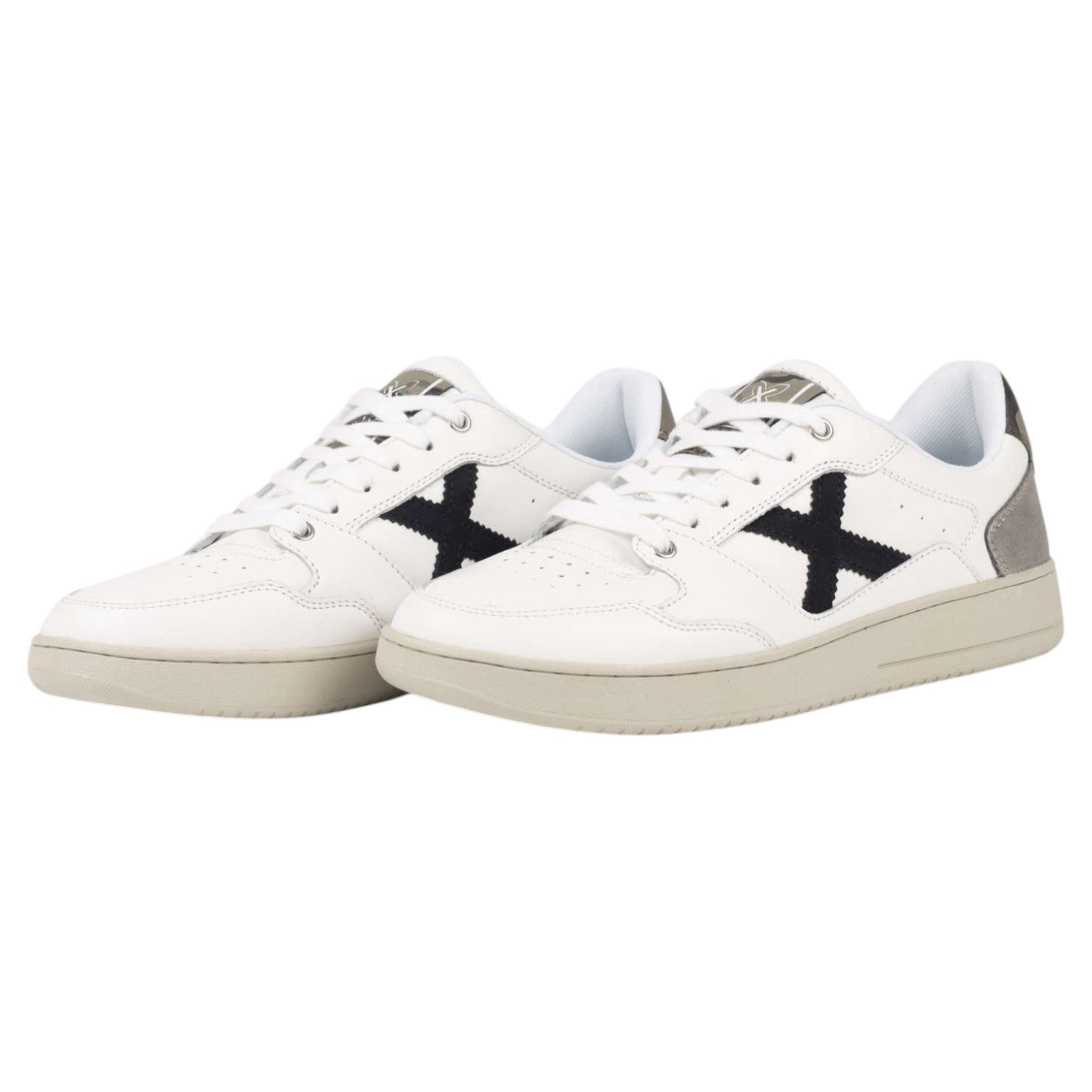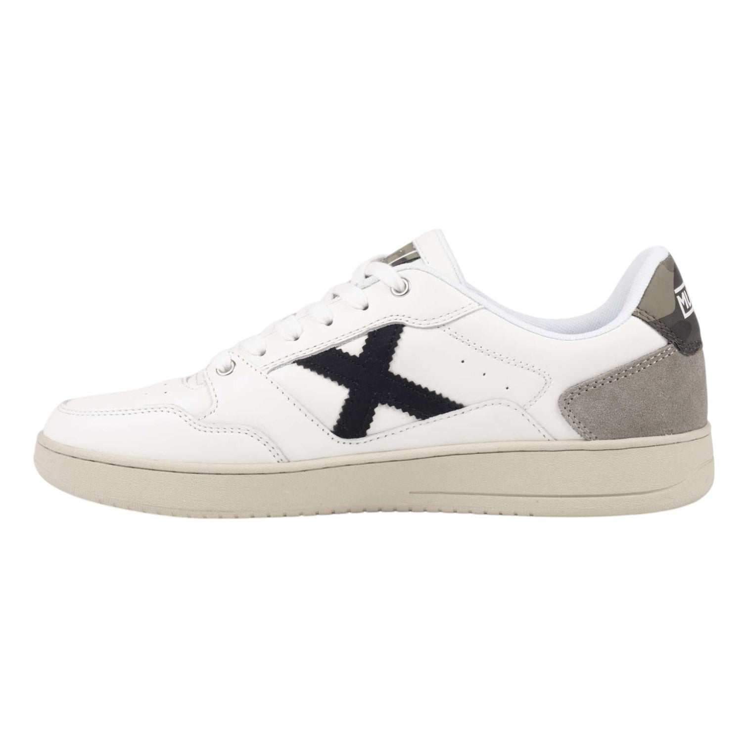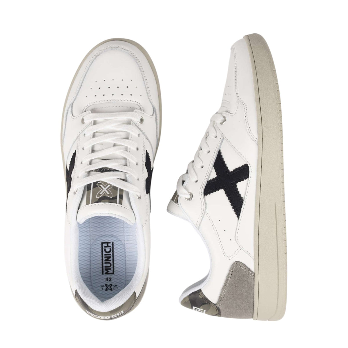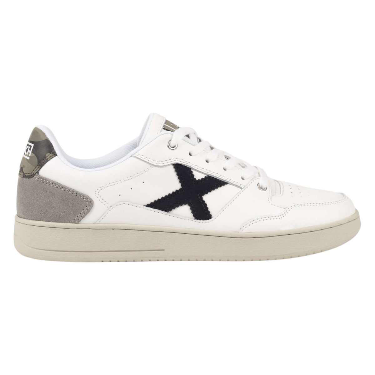 La Sneakers firmata Munich, modello presenta il logo laterale in nero e un originale rinforzo sul tallone con stampa camouflage, il tutto completato da inserti in pelle scamosciata grigia sulla punta per una maggiore durata. È la calzatura perfetta per chi cerca un tocco di personalità nel proprio look da ufficio, per godersi uscite informali con gli amici o per elevare un outfit basico quotidiano con un'estetica sportiva intramontabile e moderna.