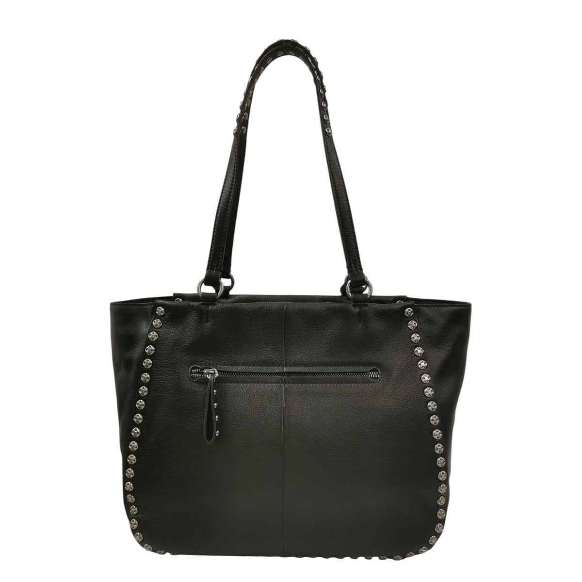 La Borsa a spalla firmata Nannini Firenze, realizzata in vera pelle nera è caratterizzata da charm con frange removibile e da applicazione di borchie lungo i bordi della borsa, l'interno è foderato in tessuto di cui dispone di tasca aperta e chiusa con zip. Con un perfetto equilibrio tra tradizione e innovazione, Nannini rimane un marchio amato dalle donne che cercano eleganza, qualità e italianità.