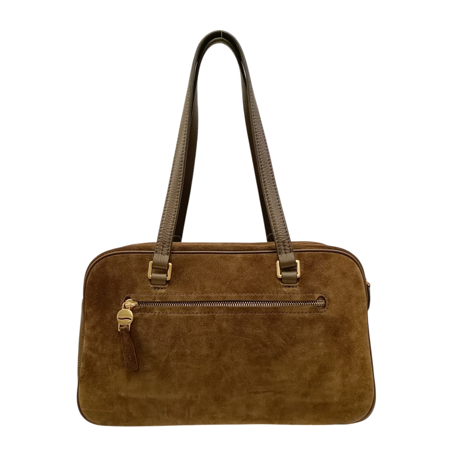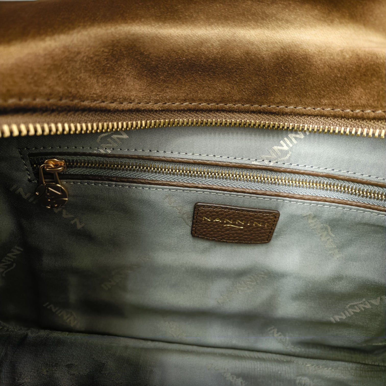 La Borsa a spalla firmata Nannini Firenze, della Linea Micol realizzata in pelle scamosciata con inserti in pelle martellata in tono è dotata di un'unica ampia tasca, presenta una taschina esterna posteriore e una tracolla removibile e regolabile. Chiusura con cerniera e inserti dorati.