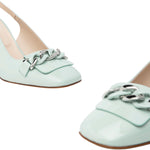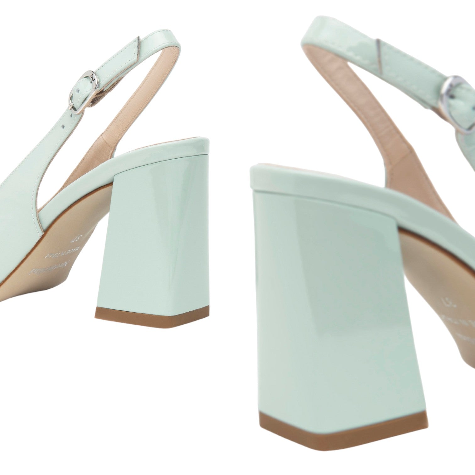 La Chanelle firmata Nero Giardini, realizzata in vernice è caratterizzata da punta squadrata impreziosita da un morsetto bicolore metallico e da tacco largo alto 8cm con finitura liscia la rende comoda e formale, inoltre dispone di chiusura con cinturino alla caviglia regolabile con fibbietta in metallo.