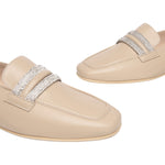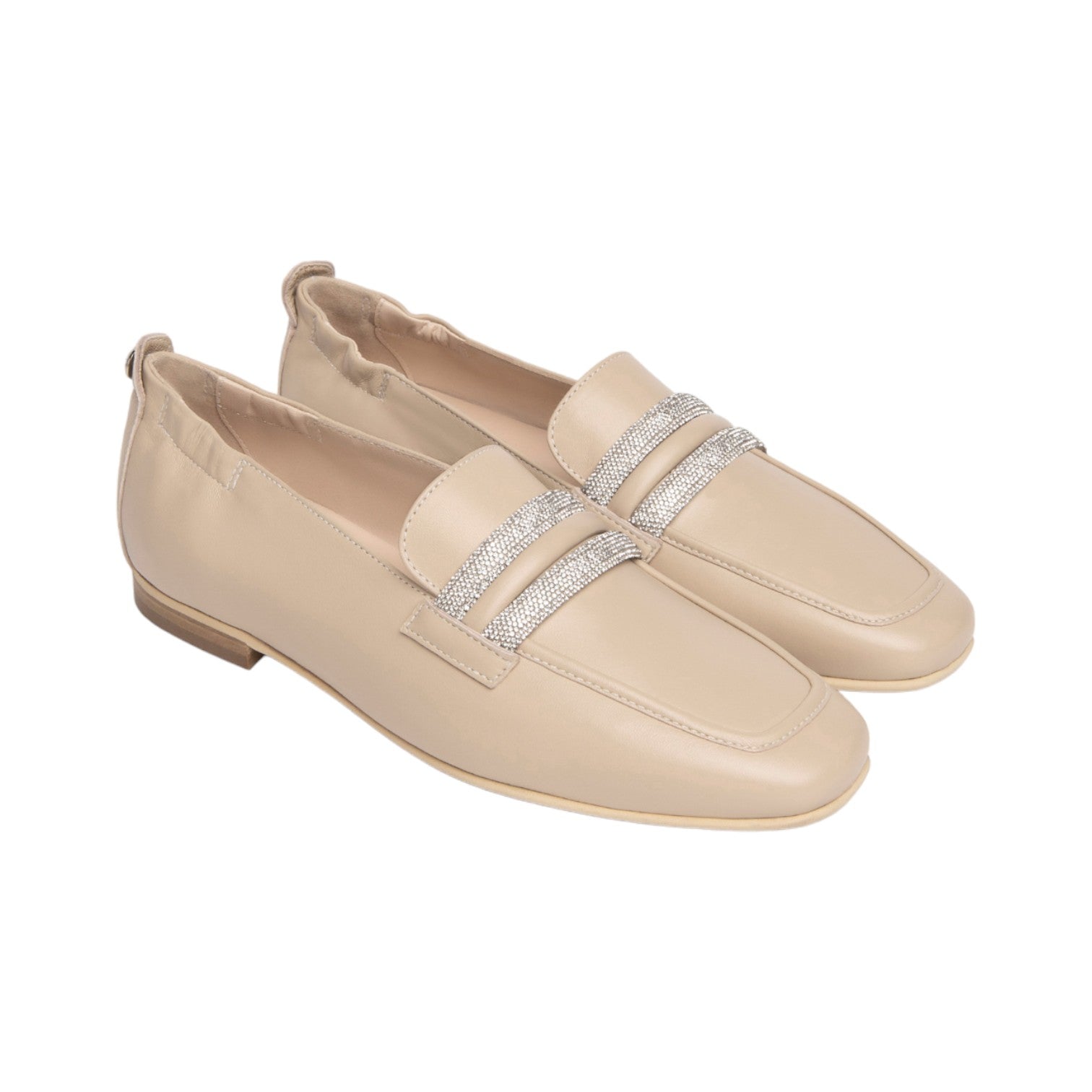 Il Mocassino firmato Nero Giardini, realizzato in pelle è caratterizzato da una punta leggermente squadrata e da due fascette tempestate di mini strass argento, con la sua tonalità neutra e versatilità senza tempo, questo mocassino si abbinano facilmente a una varietà di outfit.
