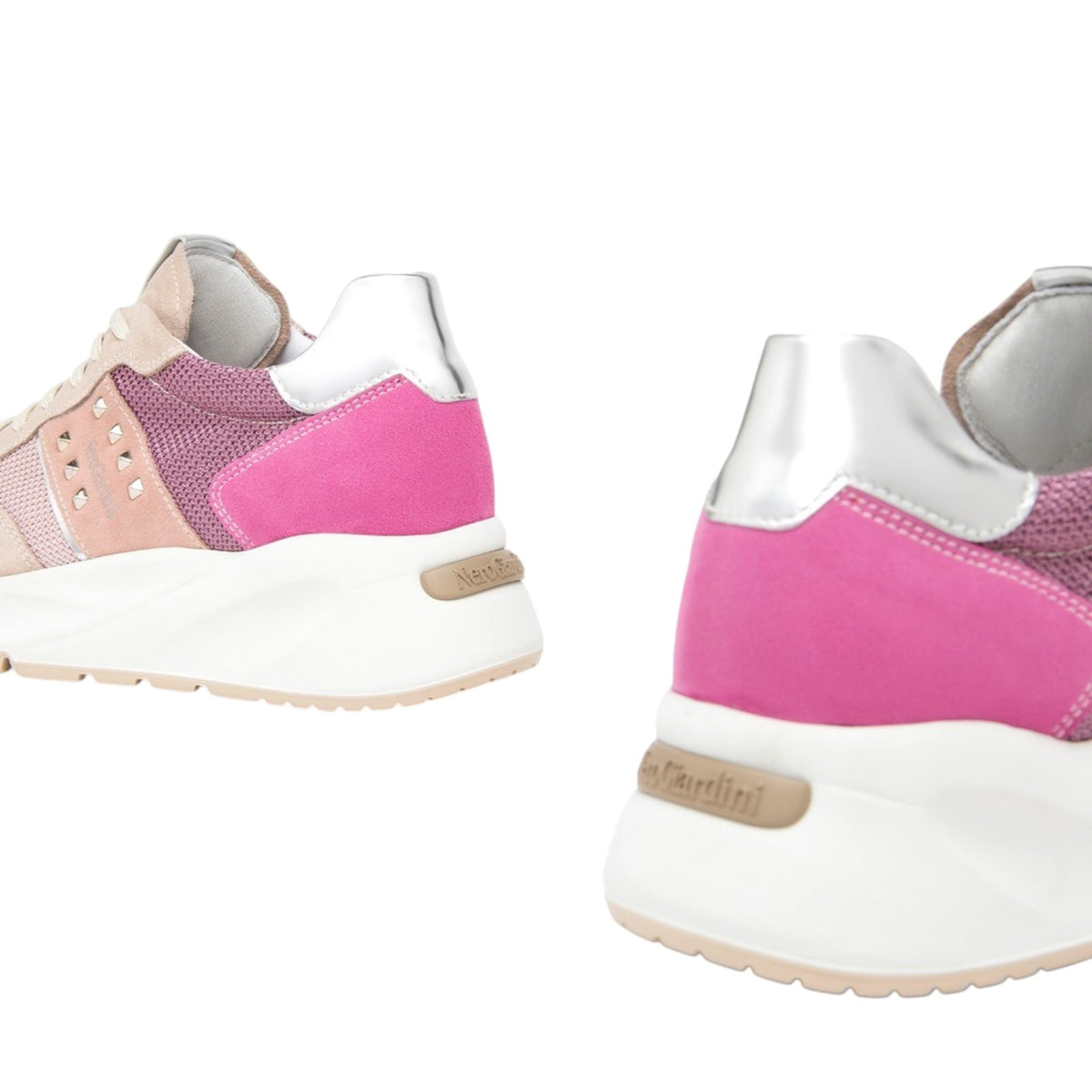 La Sneakers firmata Nero Giardini, realizzata in camoscio è caratterizzata da inserti in tessuto e il design è arricchito da dettagli con borchie laterali e da una pratica zip laterale, esaltando la femminilità di chi le indossa. Il tacco a zeppa di 4.5cm offre quella giusta elevazione, rendendole ideali per qualsiasi momento della giornata.