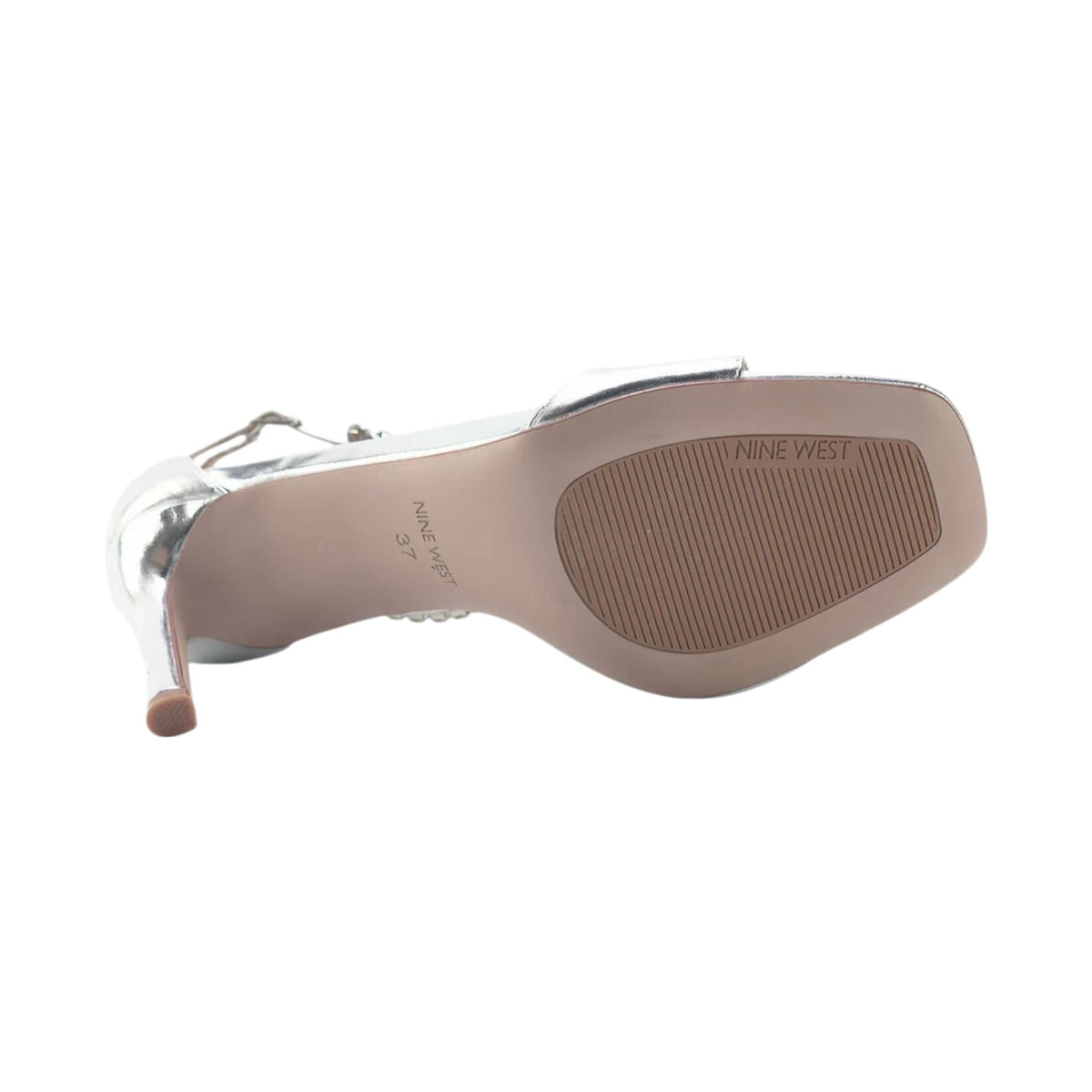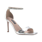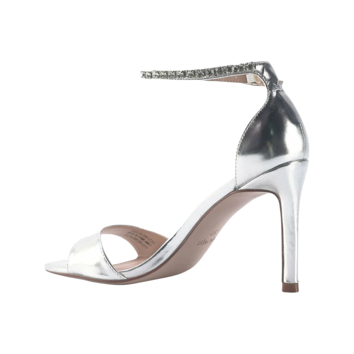Il Sandalo firmato Nine West, realizzato in similpelle laminata argentata presenta un cinturino alla caviglia con mini diamantini.