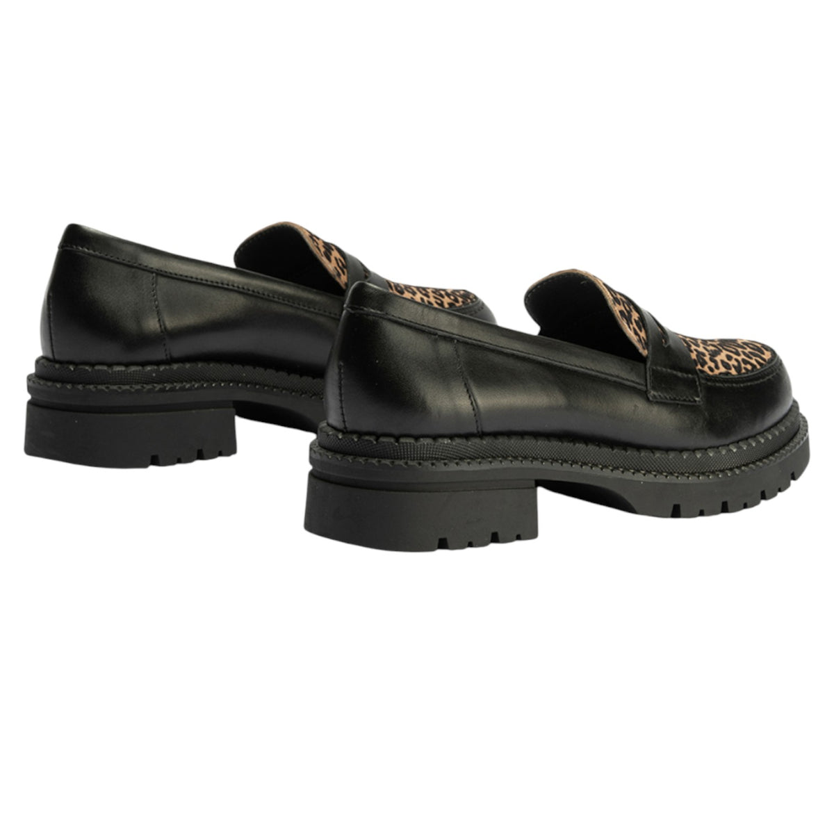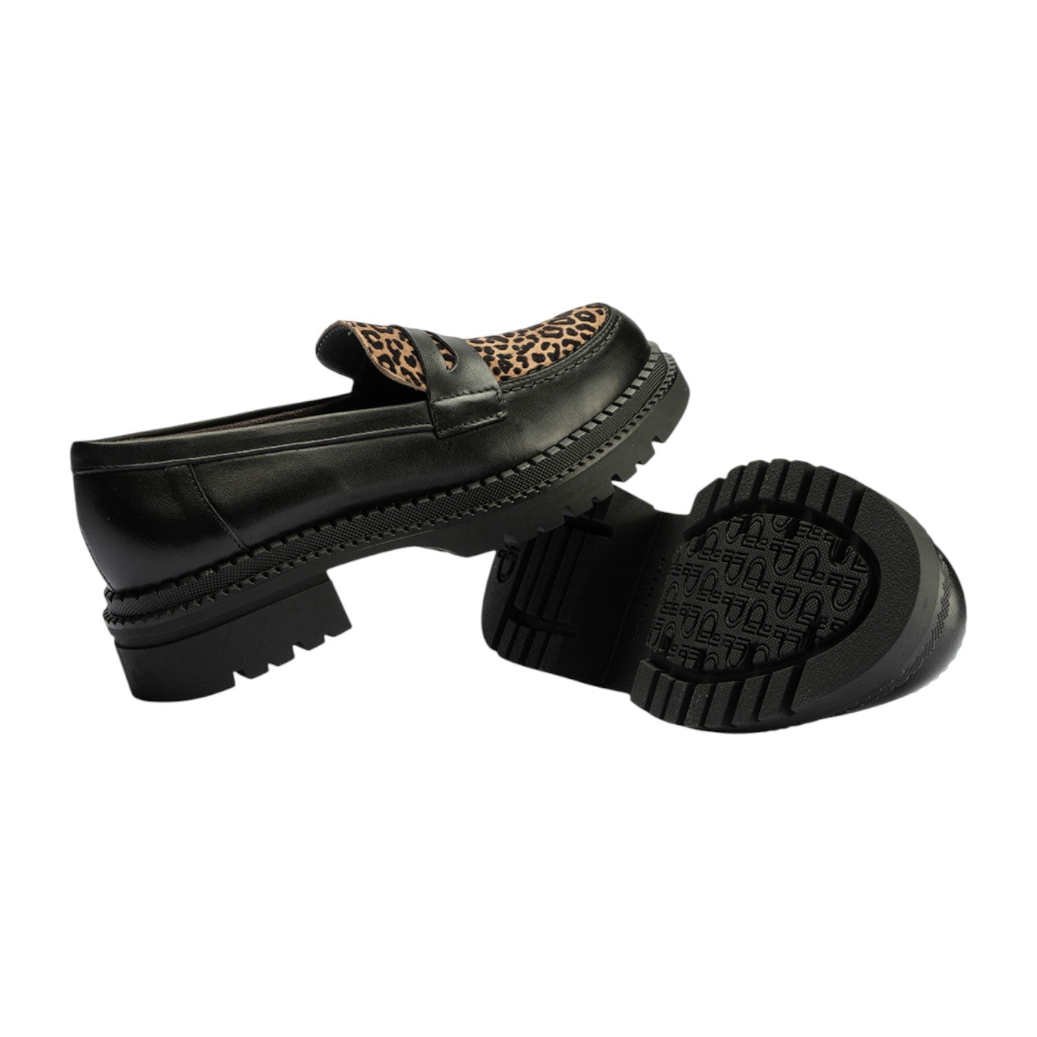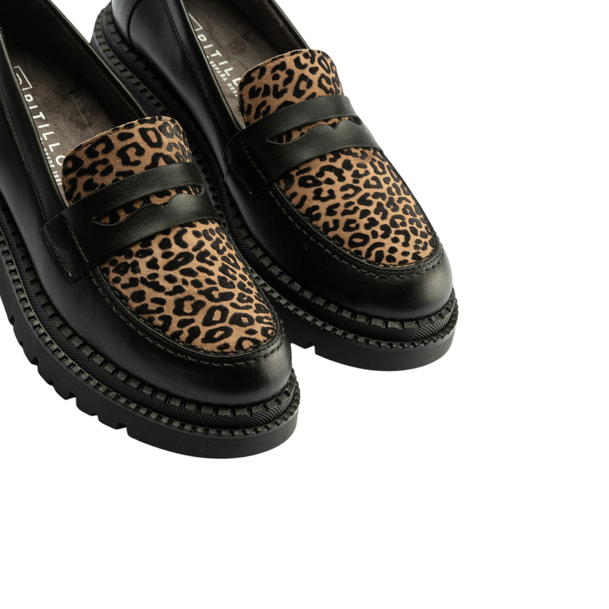 Il mocassino firmato Pitillos in pelle da Donna, è pensato per chi cerca presenza e stile. Realizzato in pelle liscia nera e opaca, si distingue per la tomaia animalier. La suola in gomma con scanalature è di 4 cm. Ideale per chi cerca una scarpa comooda, perfetta per look casual ed elegante senza rinunciare al comfort.