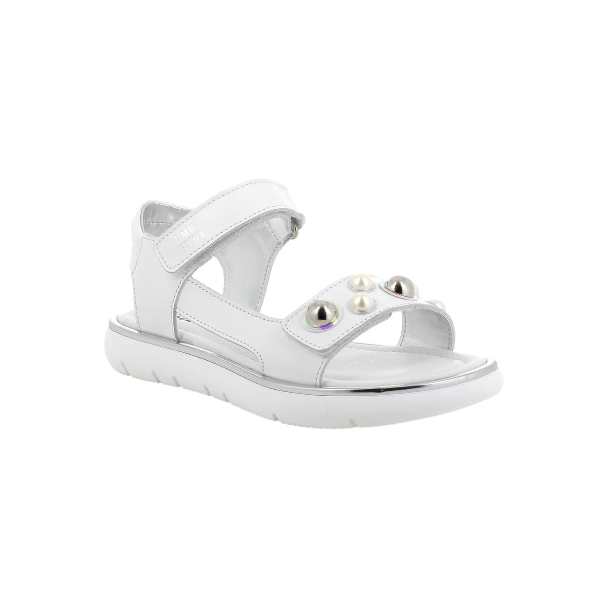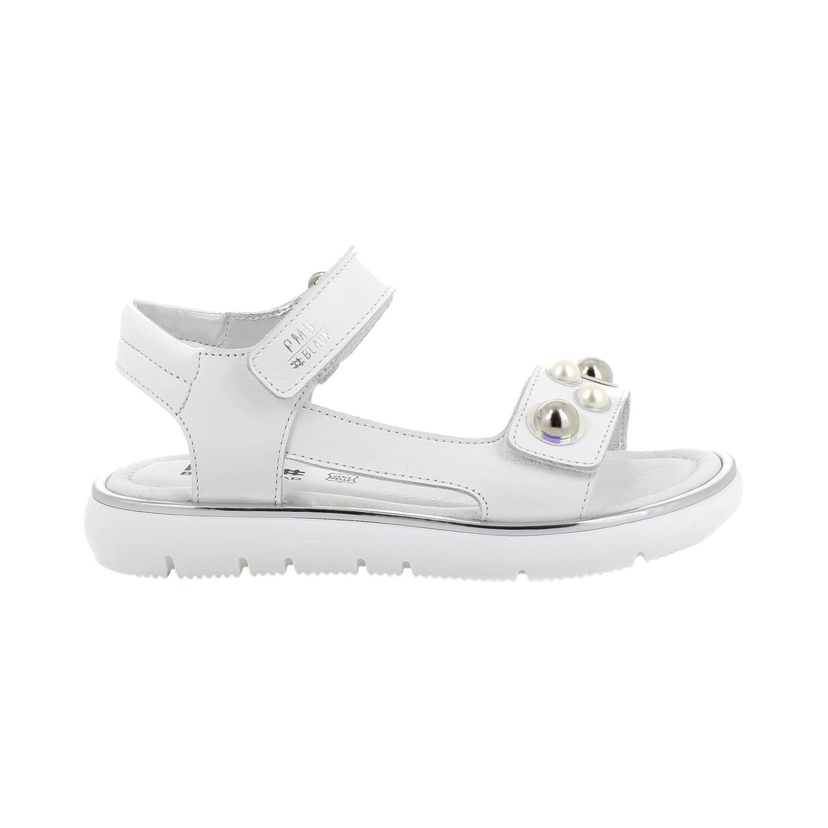 Il Sandalo firmato Primigi, realizzato in ecopelle bianca dalla silhouette sportiva con perline applicate sulla fascia davanti, che è anche regolabile, presenta un'imbottitura posteriore alla caviglia e un sottopiede, rigorosamente in pelle, rimane igienico ed è delicato al contatto. La suola piatta e spessa offre stabilità mentre isola al meglio dalle asperità del suolo.