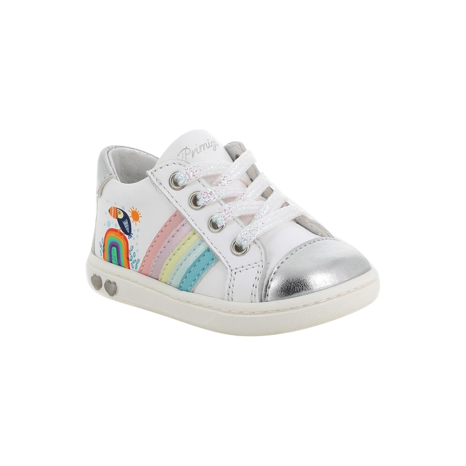 La Sneakers firmata Primigi, realizzata in pelle è caratterizzata da una stampa arcobaleno laterale e da lacci che permettono una calzata regolabile e sicura, e la pratica zip interna le rende particolarmente comode da infilare. La suola, resistente e antiscivolo, garantisce un'ottima aderenza su diverse superfici, offrendo stabilità e sicurezza. Il sottopiede estraibile è un elemento pratico, ideale per agevolare la pulizia e mantenere un ambiente fresco e igienico.