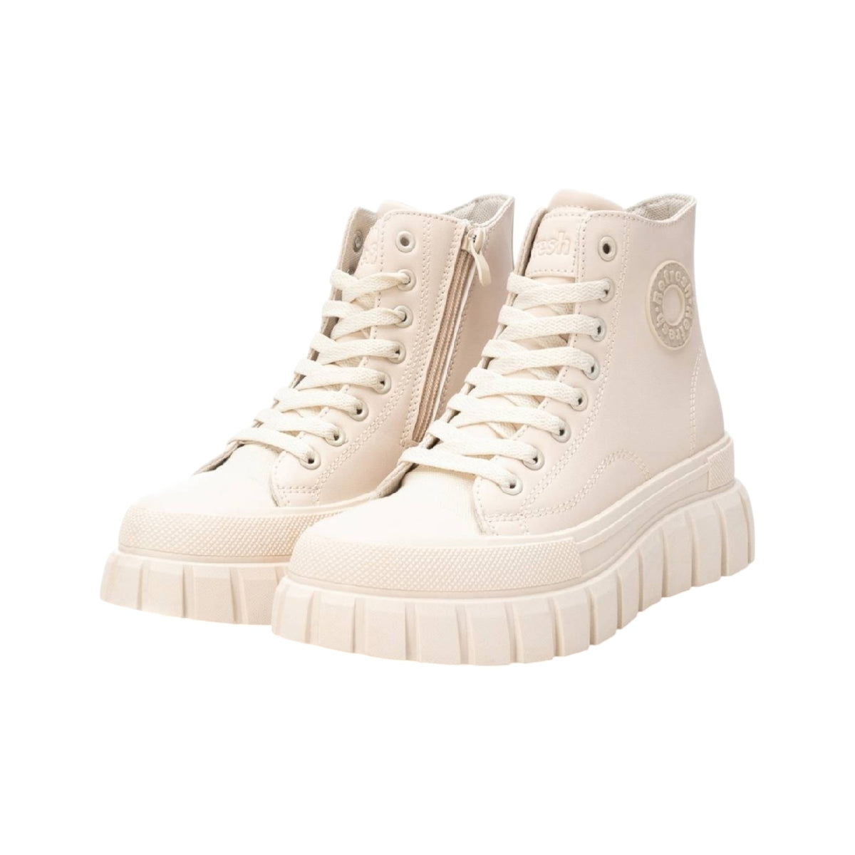 La Sneakers alta firmata Refresh, realizzata in ecopelle qui proposta nella variante beige è caratterizzata da suola rialzata di 6cm e da logo del marchio laterale, la chiusura con lacci e zip laterale offre una calzata comoda, grazie al plantare estraibile, puoi personalizzare il sostegno del piede.