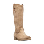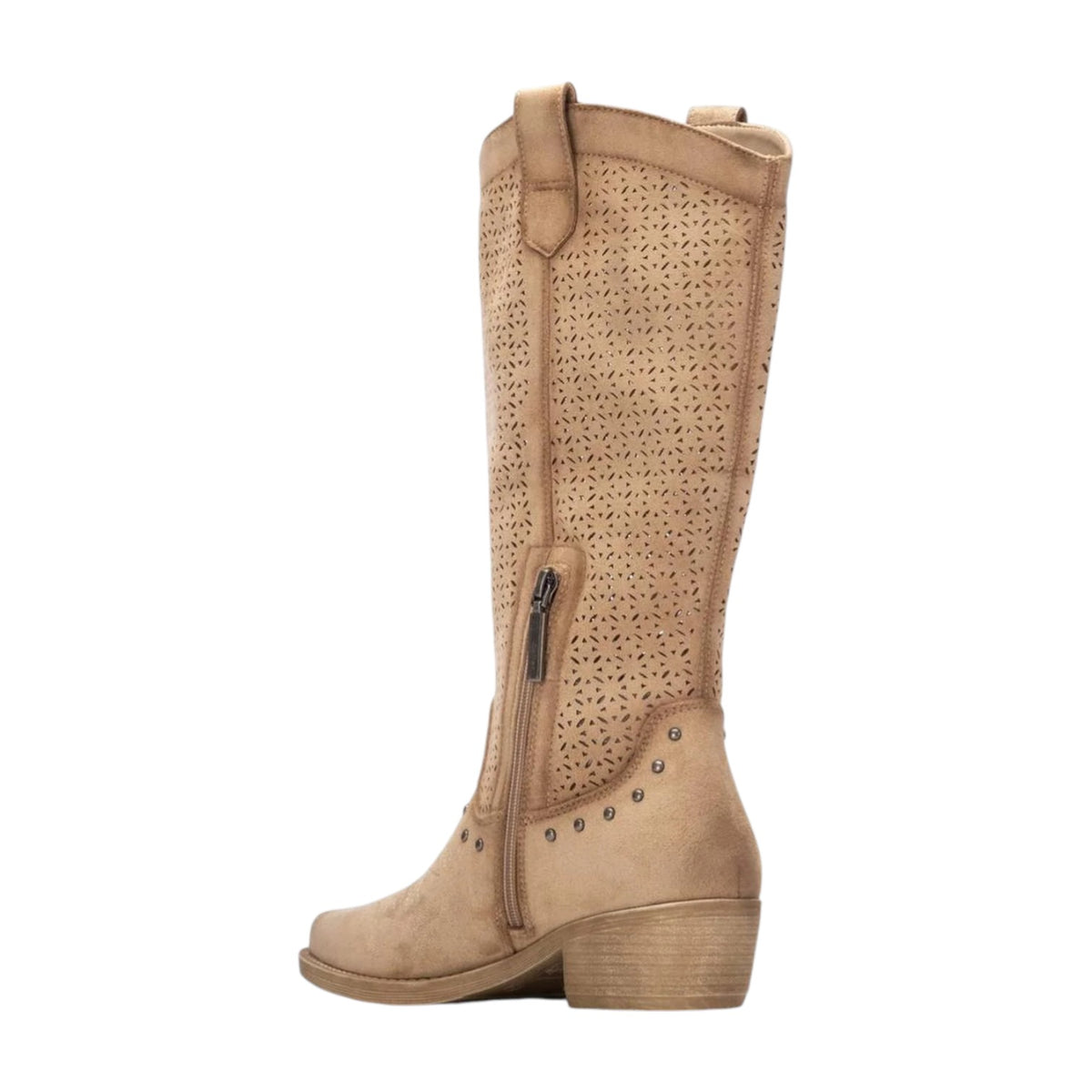 Lo Stivale firmato Refresh, realizzato in camoscio dallo stile western chic, realizzato in tonalità beige con lavorazione traforata su gambale e dettagli decorativi. Presenta un tacco basso effetto legno, ideale per look casual e boho di mezza stagione.