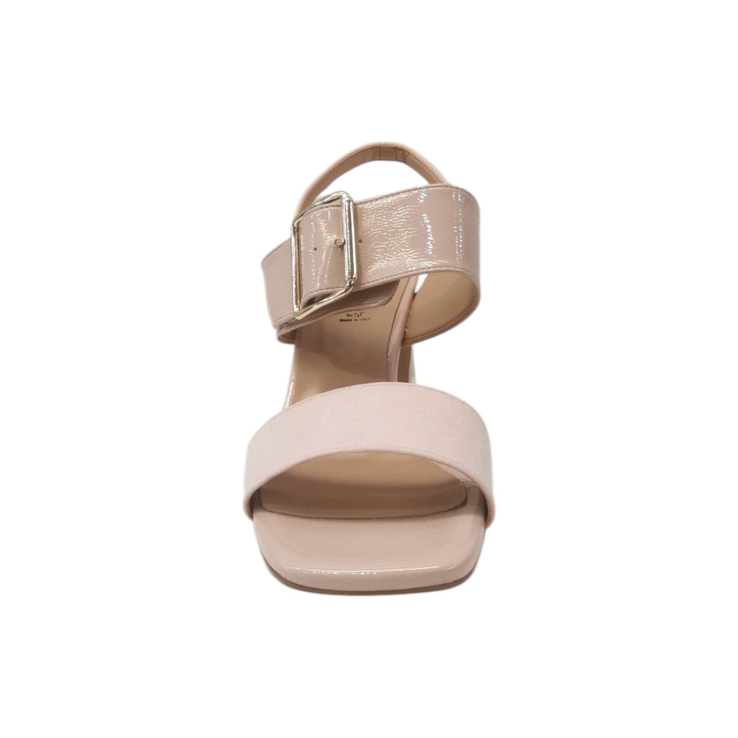 Il Sandalo firmato Scarpeborseonline, realizzato in camoscio sintetico e vernice è caratterizzato da doppia fascia di cui una è con cinturino regolabile, e da interno foderato in ecopelle con sottopiede rivestito in pelle, il tacco alto 9cm offre un maggior comfort.