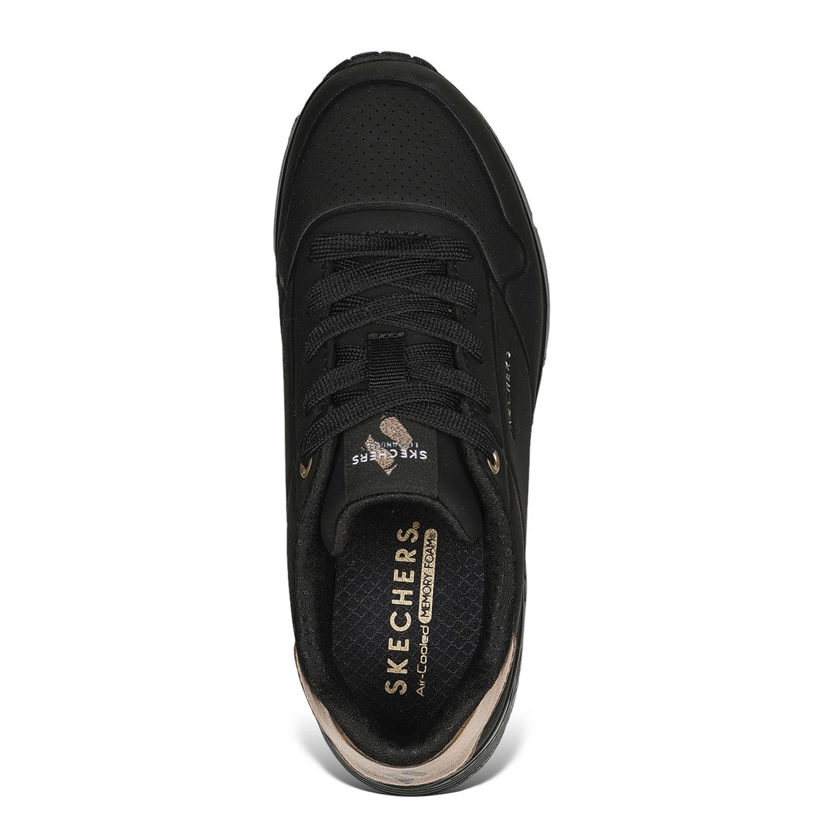 La Sneakers firmata Skechers, realizzata con una tomaia in ecopelle e tessuto con finiture metallizzate è caratterizzata da una chiusura con lacci e soletta Skechers Air Cooled Memory Foam®, con intersuola ammortizzata ad aria con tecnologia visibile Skech-Air®.