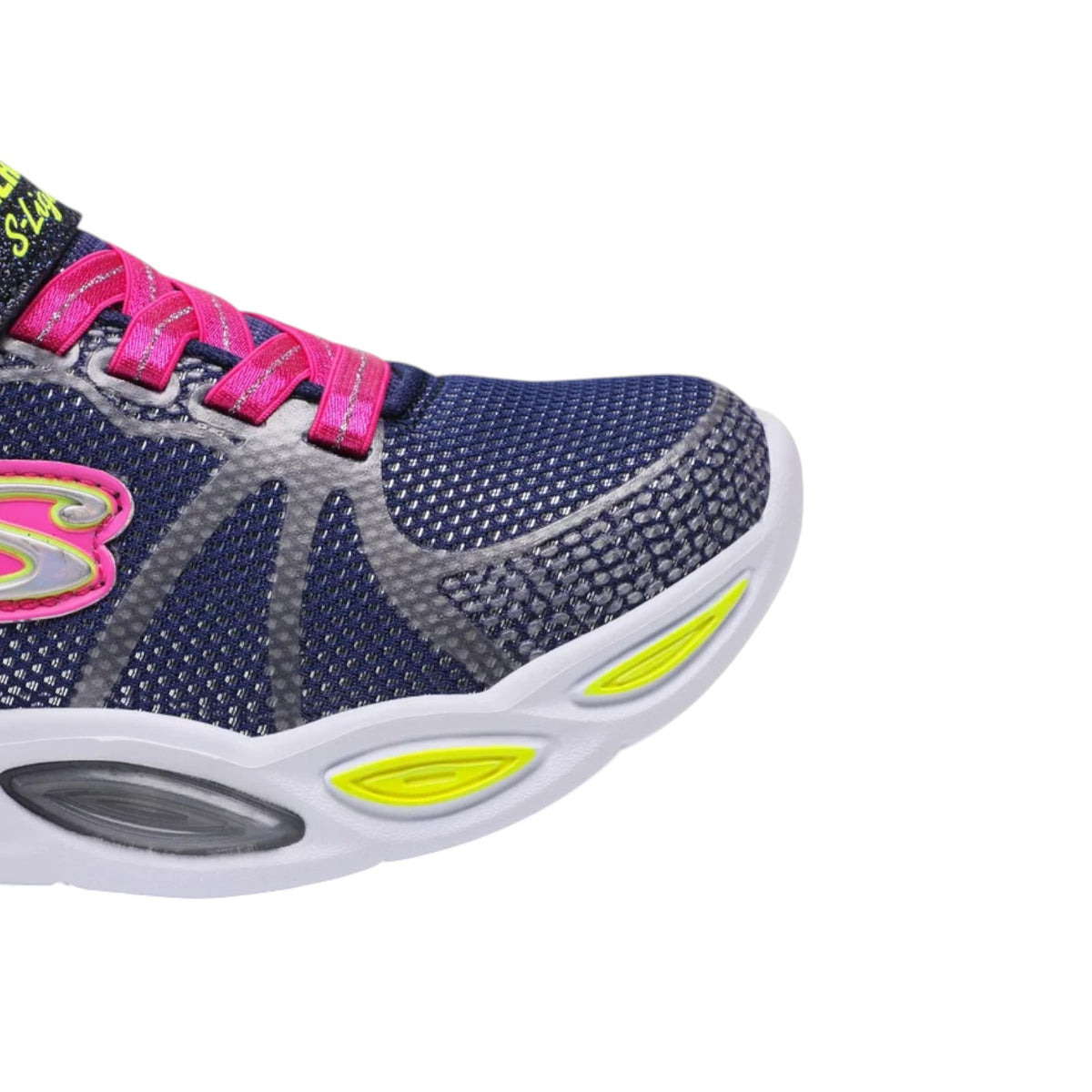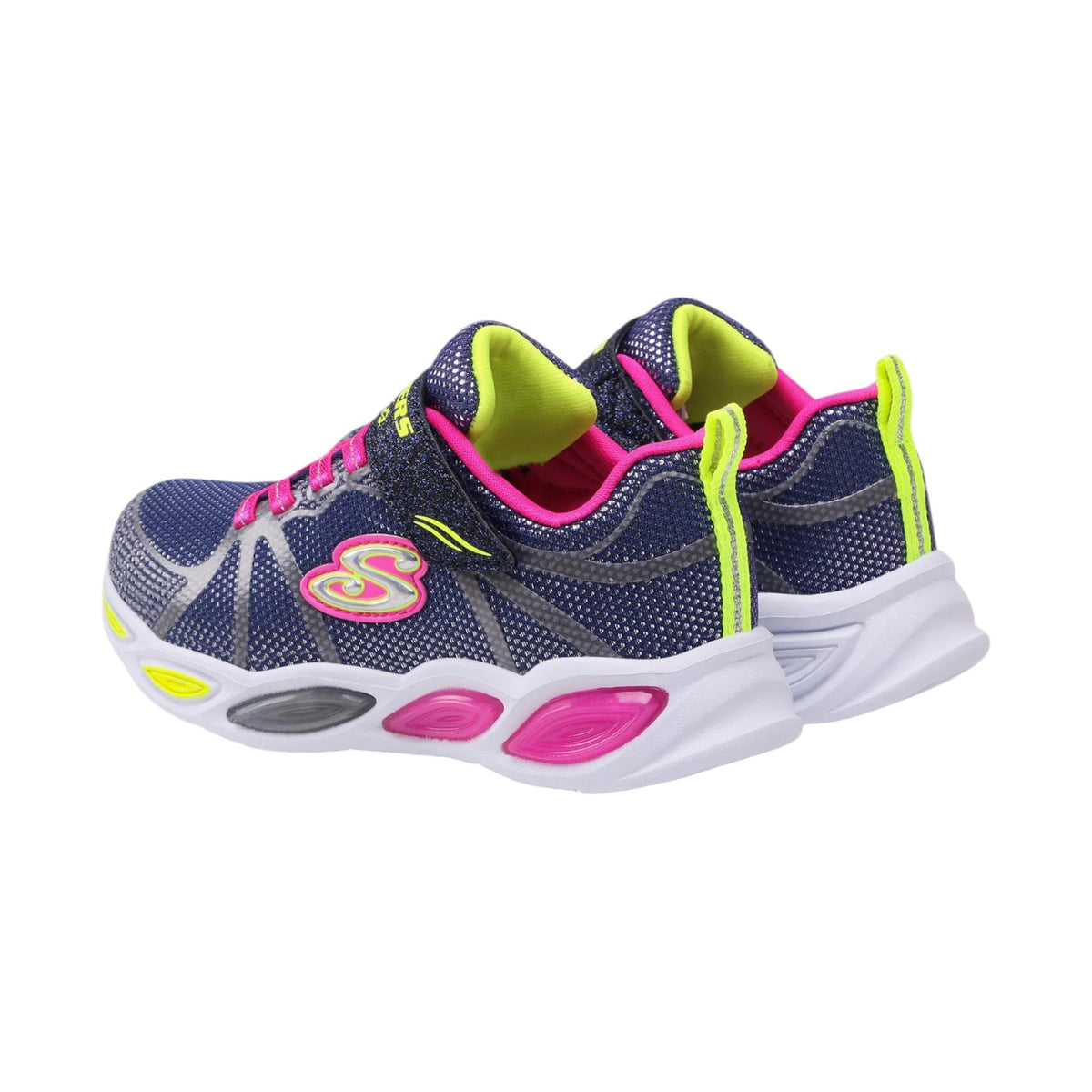 La Sneakers firmata Skechers, presenta una tomaia in tessuto multicolore con sovrapposizione di stampa tattile, lacci elastici, cinturino regolabile sul collo del piede e una soletta interna ammortizzata e comoda. Sono presenti luci a led all’interno deli oblò, nella suola in gomma a contrasto bianca.