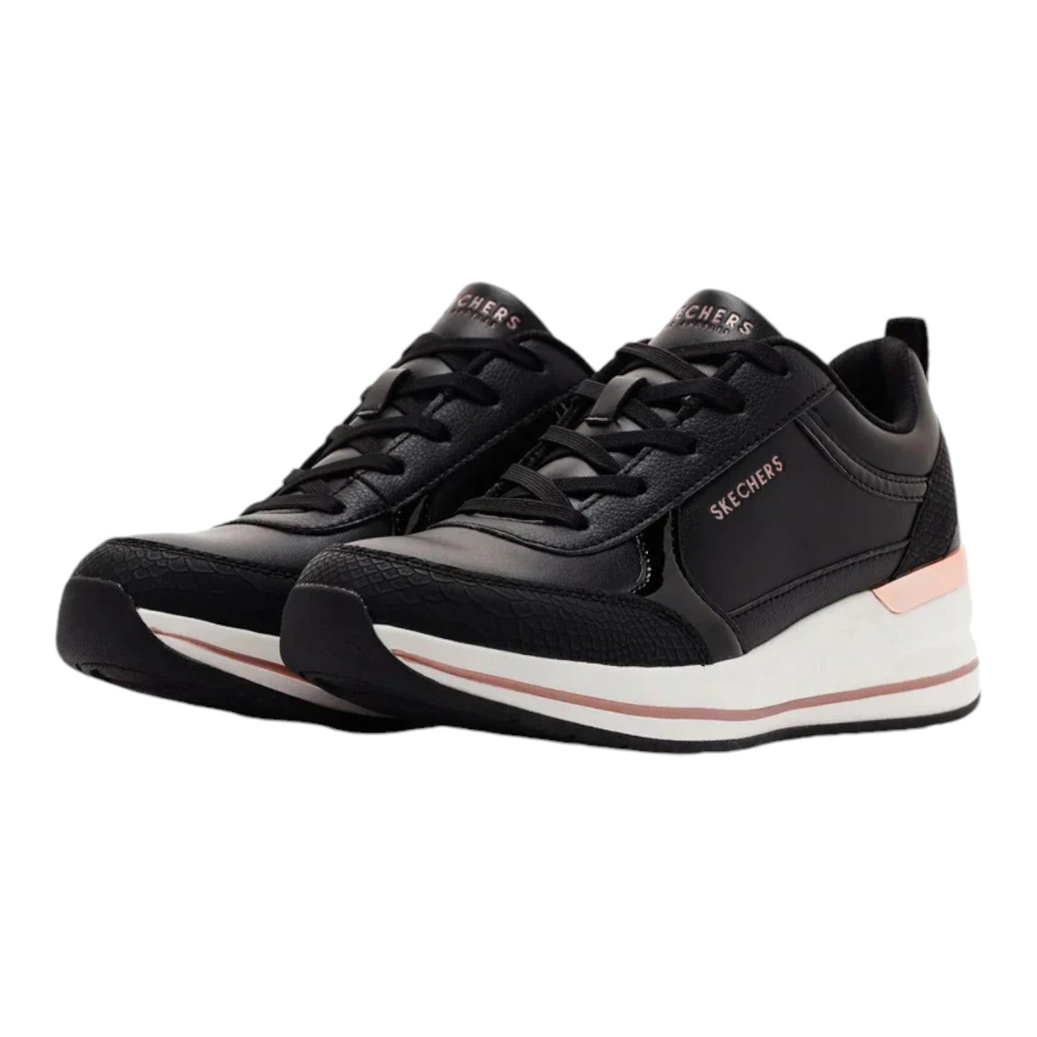 La Sneakers firmata Skechers, scarpa allacciata alla moda presenta una tomaia in duraleather con finiture in rettile, un'intersuola a zeppa e una soletta Skechers Air-Cooled Memory Foam. La suola esterna in gomma sintetica flessibile fornisce trazione sotto il piede, mentre la chiusura con lacci consente una calzata sicura e regolabile.