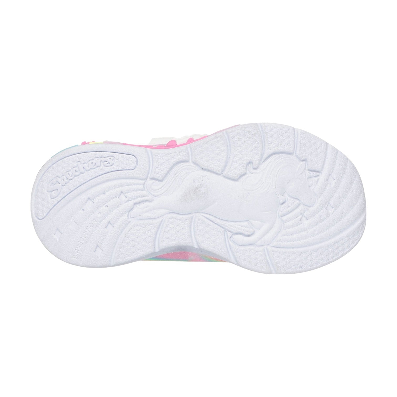 La Sneakers firmata Skechers, design sportivo illuminato della Magical Collection® presenta una tomaia sintetica con finitura glitterata con grafica laterale con unicorno e arcobaleno, lacci elastici, cinturino regolabile sul collo del piede e un plantare imbottito e confortevole.