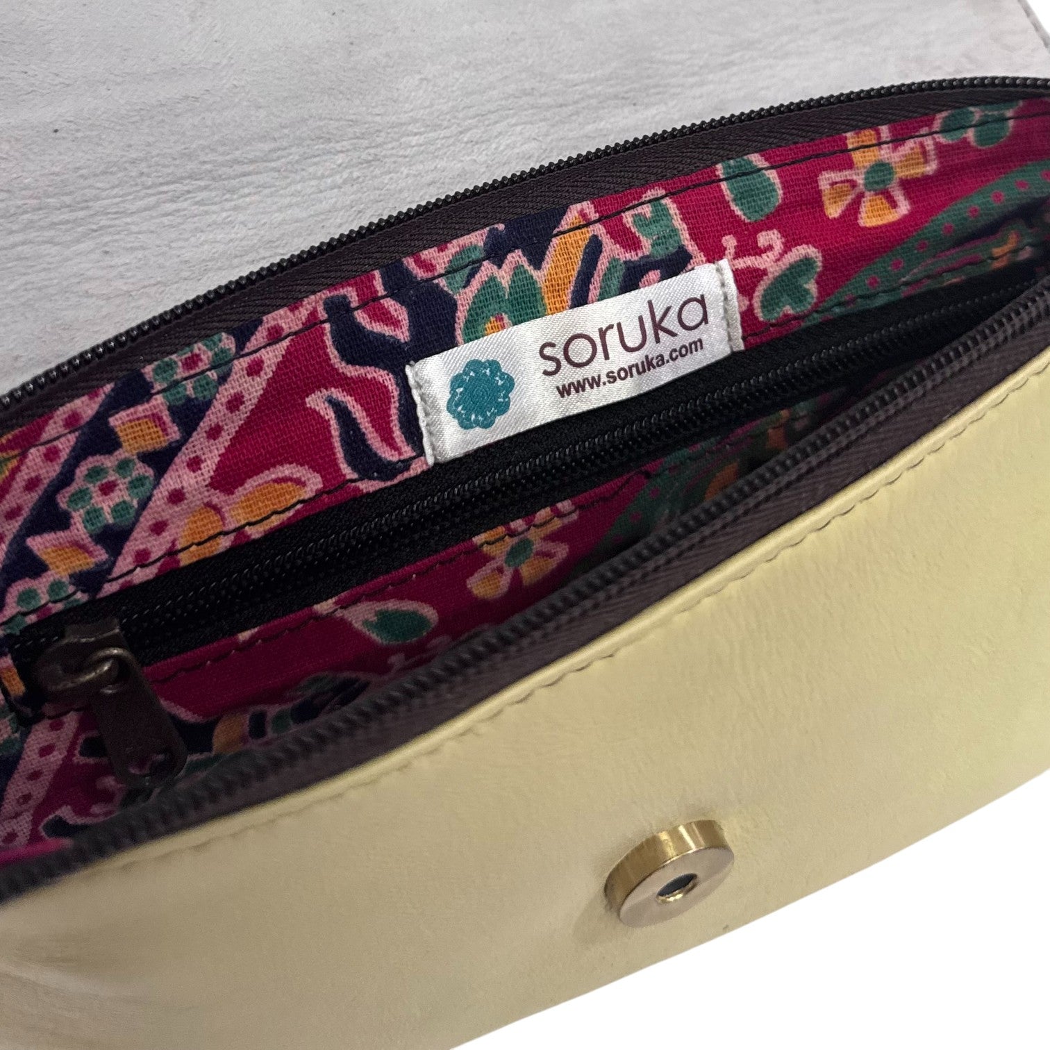 La Tracolla firmata Soruka, è caratterizzata da inserti multicolor, presenta una linguetta centrale, una tracolla regolabile e l'interno è foderato in tessuto a fantasia con taschino con zip, il polsino removibile con tracolla la rendono portabile sia a mano che a tracolla, modello a produzione “zero waste” equa e responsabile che utilizza gli scarti di pelle. Soruka è un progetto che trasforma scarti di pelle in accessori moda unici, sostenibili e fatti a mano.