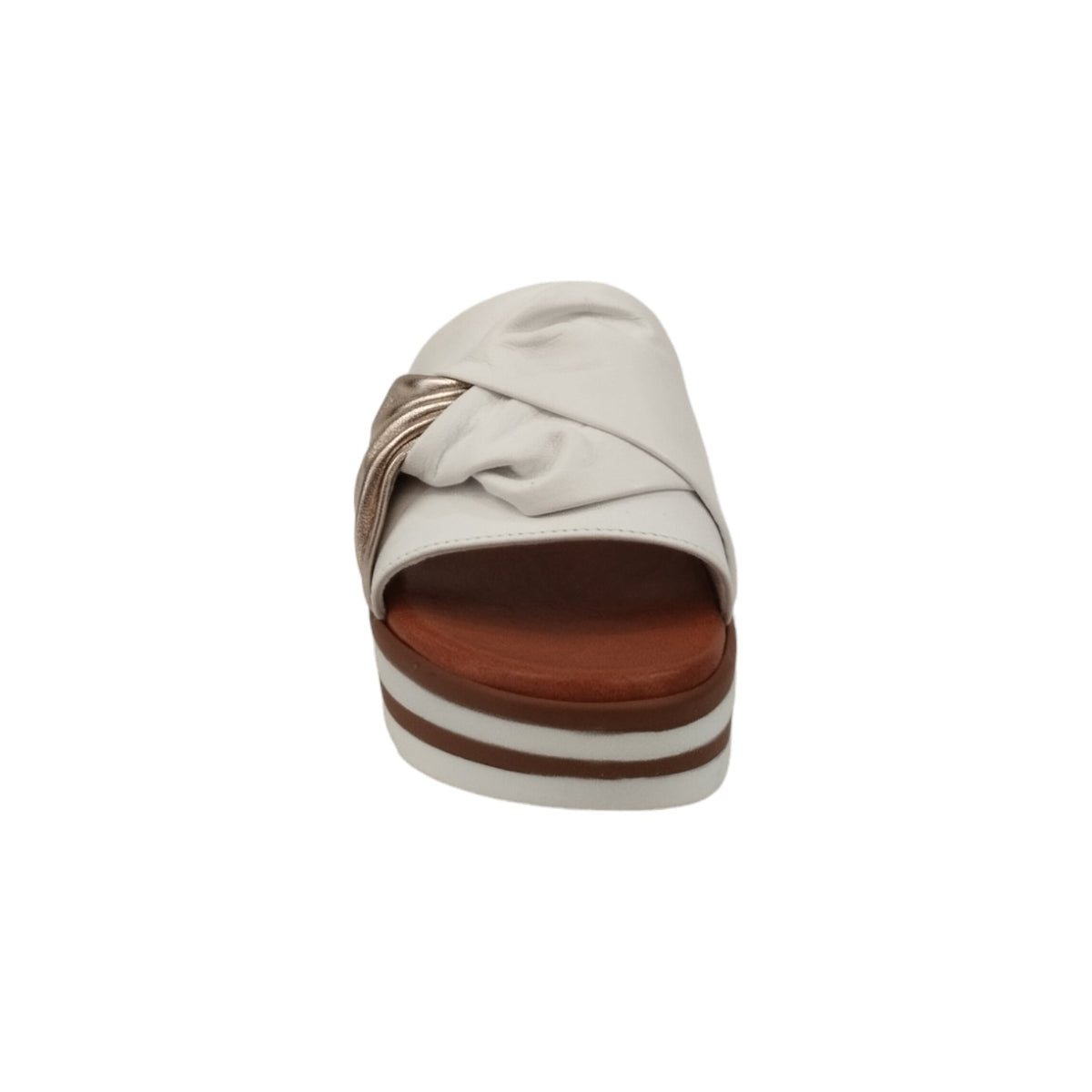 La Ciabatta firmata Susimoda, realizzata in pelle è caratterizzato da una fascia con nodo in pelle bianca e dorata laminata e da plantare morbido in pelle piuma gel accompagnato da una fodera interna in pelle, inoltre dispone di una comoda zeppa alta 6cm.