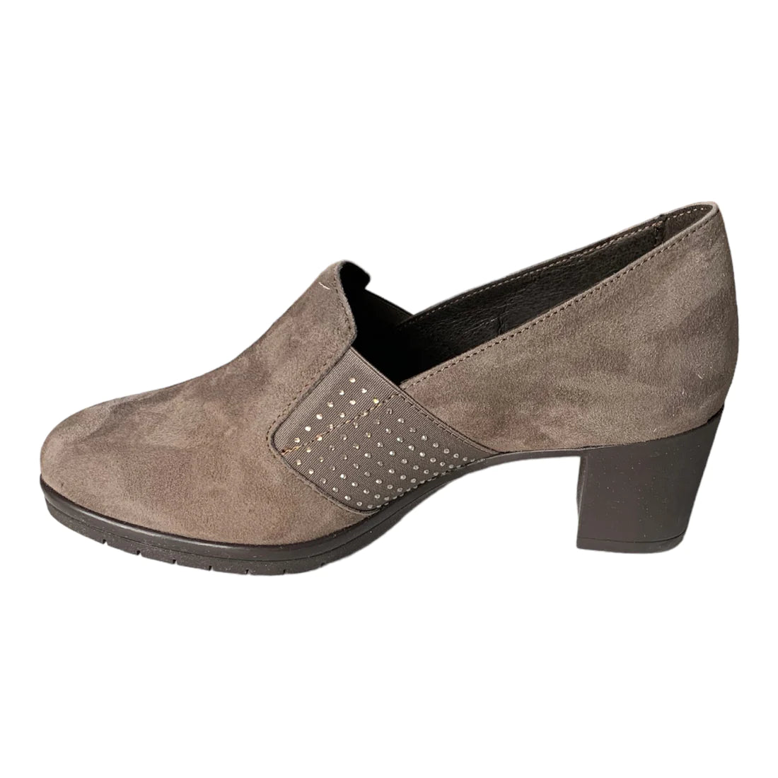 Il Mocassino firmato Susimoda, realizzato in camoscio è caratterizzato da due fasce elastiche in tessuto laterali con applicazione di mini strass neri, e da interno foderato in pelle e tessuto con un comodo tacco alto 4cm.