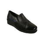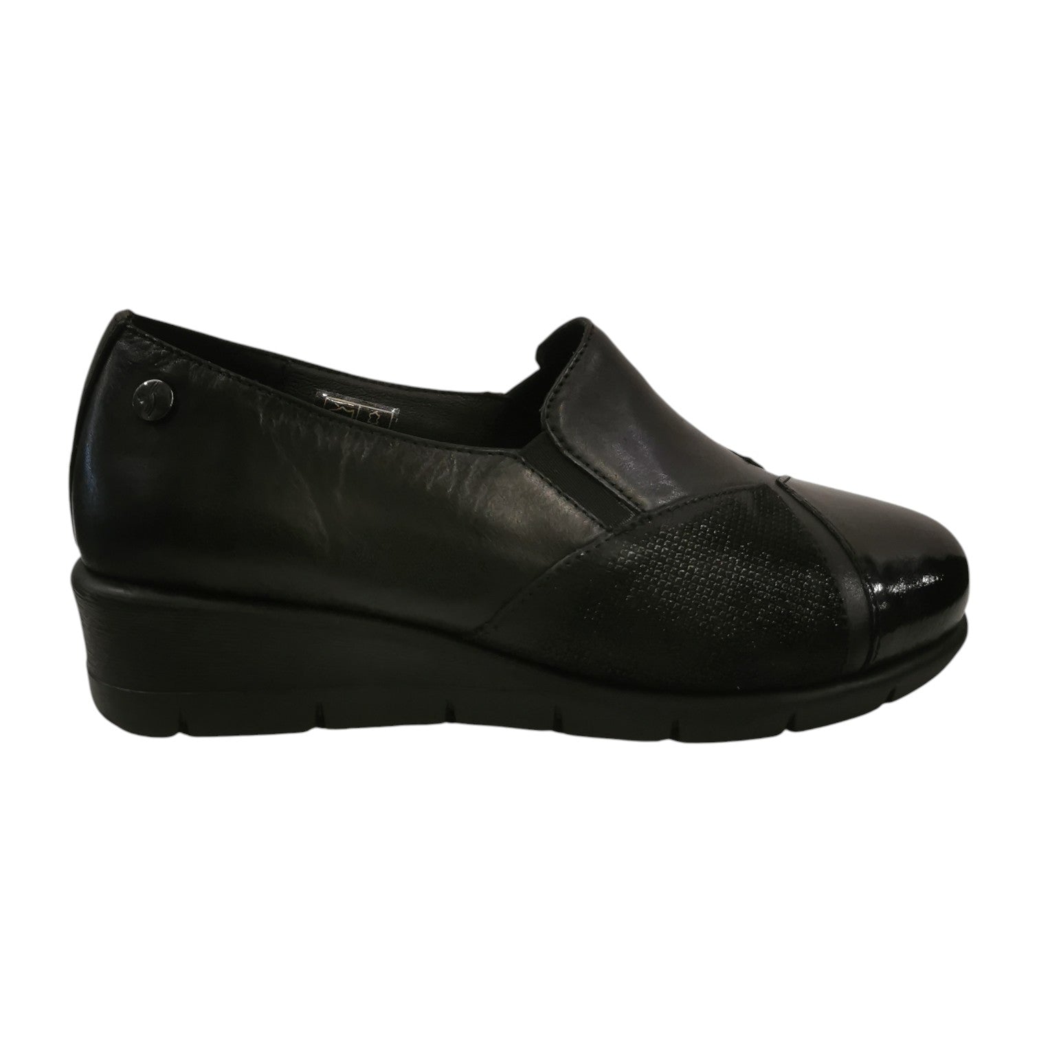 Il Mocassino firmato Susimoda, modello casual e alla moda realizzato in pelle nera è caratterizzato da inserti in vernice in punta e da elastici laterali per favorirne la calzata, la fodera in tessuto è imbottita e il plantare in pelle offre comfort.