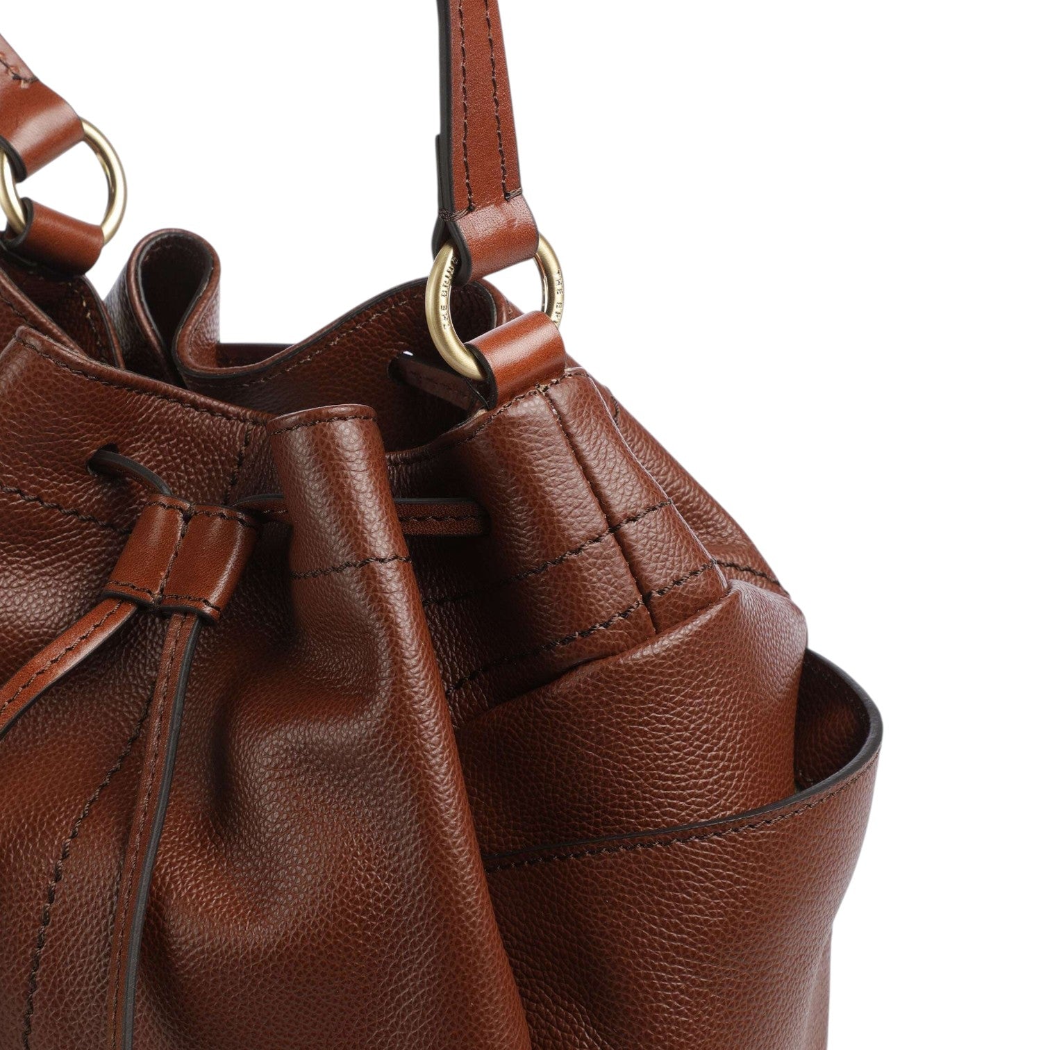 Il Secchiello firmato The Bridge, realizzato in pelle qui proposta nella variante cuoio è caratterizzato da chiusura a coulisse e da tracolla regolabile per portarlo a spalla, l'interno è foderato in tessuto di cui dispone di taschino con zip. Portala con te al lavoro o per un'uscita serale, grazie al suo design versatile e intramontabile.